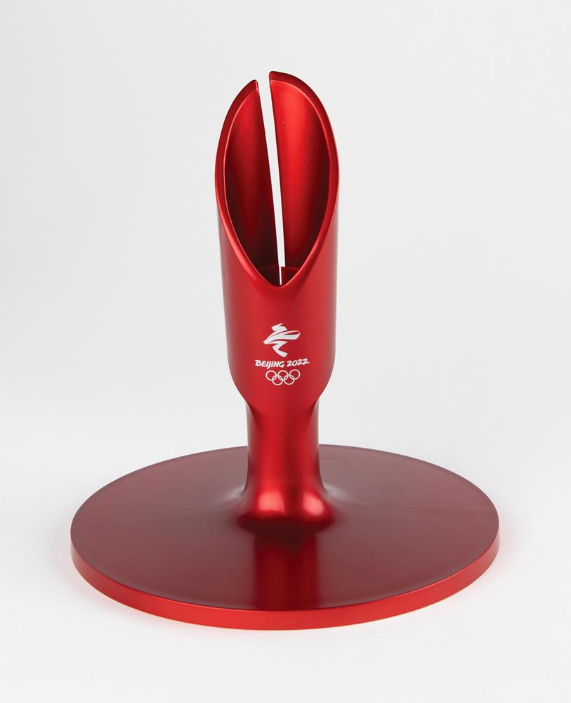 Beautifully made display base for the official relay torch of the Beijing 2022 Winter Olympics. The base is constructed of a resin-coated carbon fiber composite, measures 8.5″ in height and 7.75″ in diameter, and features the Beijing 2022 emblem to the front of the torch holder; the underside of the base is numbered “9731.” Like the torch, the base utilizes a design inspired by the natural flowing beauty of plants and flowers, a theme that meshed with Beijing’s green approach to the torch’s materials and combustion fuel—carbon fiber composite, a new material made of petroleum products, and hydrogen gas, a special fuel that proved both smoke-free and environmental-friendly. The base includes a certificate of authenticity and the original shipping box, both of which are numbered “9763,” edition numbers that do not match with the offered base.