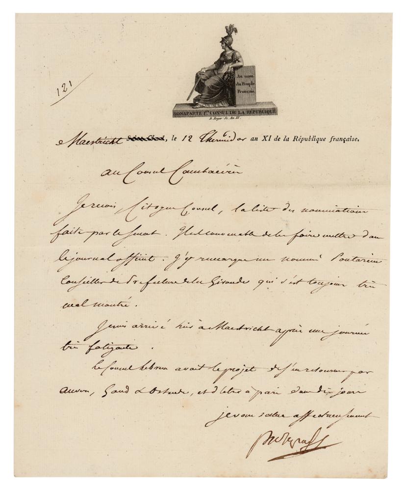 LS in French, signed “Buonaparte,” one page, 7.25 x 9, attractive letterhead with a Republican vignette reading "Au nom du Peuple Français - Bonaparte Consul de la République," July 31, 1803. Letter to Jean-Jacques-Régis de Cambacérès, the statesman best remembered as one of the authors of the Napoleonic Code. In full (translated): "I receive Citizen Consul, the list of the nominations done by the Senate. It would be appropriate to publish them in the official journal. I have spotted someone named Pontarein, Councilor of the Prefecture of the Gironde, who has always shown bad manners and behavior. I arrived in Maastricht yesterday after a very tiring day. Consul Lebrun had plans to return via Antwerp, Ghent & Ostend, and to be in Paris in ten days." In fine condition. At the end of June 1803, Napoleon, as First Consul, started an inspection trip to the north of France and Belgium; during this time he worked on his first plan to invade England.