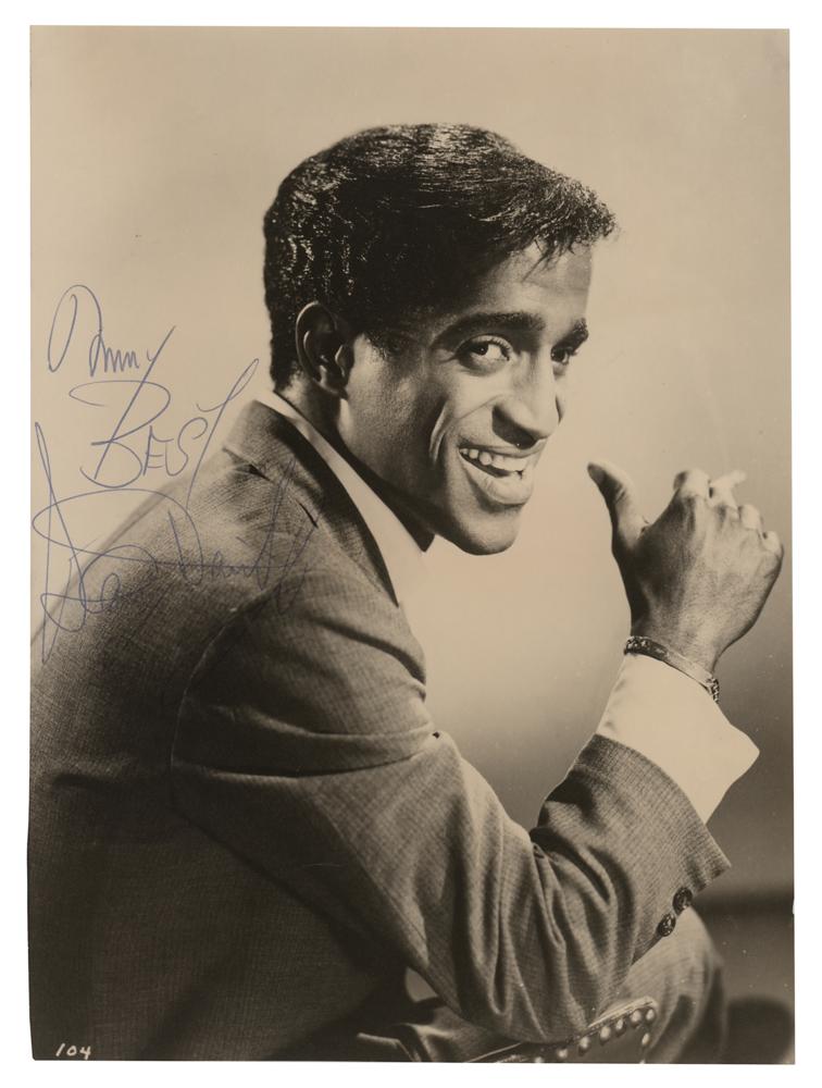 Vintage matte-finish 6.75 x 9.25 photo of a young Sammy Davis seated and smiling and holding a cigarette, signed in ballpoint, "My best, Sammy Davis, Jr." In fine condition, with trimmed edges.