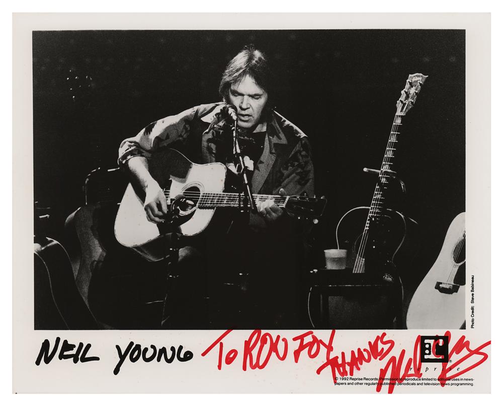 Satin-finish 10 x 8 Reprise Records publicity of Neil Young that dates to the release of his Harvest Moon album, signed and inscribed in the lower border in red felt tip, "To Ron Fox, Thanks, Neil Young.” In fine condition.
