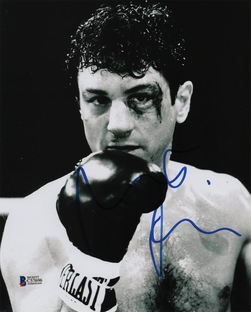 Glossy 8 x 10 close-up photo of Robert De Niro as middleweight champion boxer Jake LaMotta in the 1980 Martin Scorsese biopic Raging Bull, signed in blue felt tip. In fine condition, with a Beckett label affixed to the lower left corner. Accompanied by a certificate of authenticity from Beckett Authentication Services.