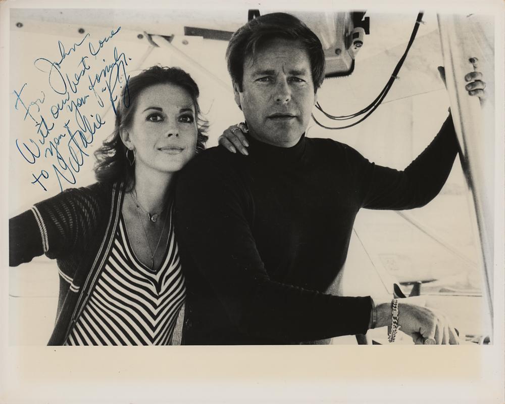 Glossy 10 x 8 photo of husband-and-wife acting couple Natalie Wood and Robert Wagner posing together on a boat, signed and inscribed by both in ink, "For John, with our best love to you + your family, Natalie" and "'R. J.'” In fine condition, with light toning from prior display, and tiny staple holes to the top edge. A notable signed image given the mysterious maritime circumstances surrounding Wood's 1981 death.