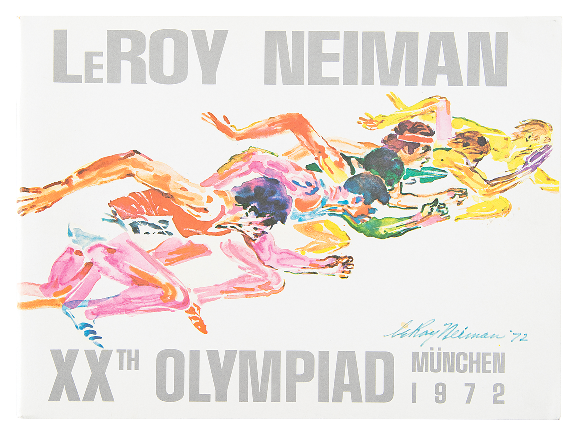 Uncommon softcover 12 x 9 book entitled "On the Spot Sketches with Commentary by LeRoy Neiman at the XXth Olympiad, Munchen, 1972," published by the Indianapolis Museum of Art for the exhibition of Neiman's work held from November 22, 1972, to January 7, 1973. The booklet reproduces many of Neiman's spontaneous sketches made while covering the Games, and bears his pre-printed facsimile signature on the front cover. In fine condition.