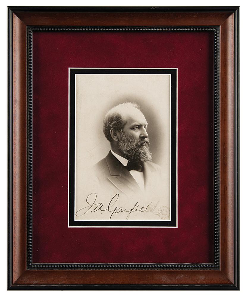 Exceptional 3.75 x 5.75 artotype cabinet portrait of James A. Garfield in a noble head-and-shoulders pose, signed in black ink, "J. A. Garfield." Published by Harroun & Bierstadt of New York. Archivally double-matted and framed to an overall size of 9 x 11. In very good to fine condition, with some light scratches and scuffs to the image, and the last letter of the signature light but legible. The image in this photograph is used in the Bureau of Engraving and Printing’s official presidential portrait of Garfield, the die for which was engraved by Lorenzo Hatch in 1881. It was also used on the 6-cent stamp issued in 1903.