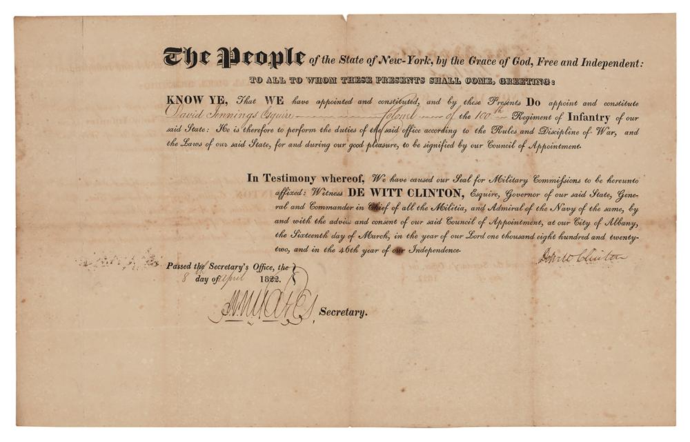 American politician (1769-1828) who served as senator and who, as governor of New York, played a major role in the construction of the Erie Canal. Partly-printed DS, one page, 15.5 x 9.75, April 8, 1822. As governor of New York, DeWitt Clinton appoints David Jennings as "Colonel of the 100th Regiment of Infantry of our said State.” Neatly signed at the conclusion by Governor Clinton and countersigned by Secretary John Van Ness Yates. In very good to fine condition, with scattered light foxing, and some splitting to the intersecting folds.