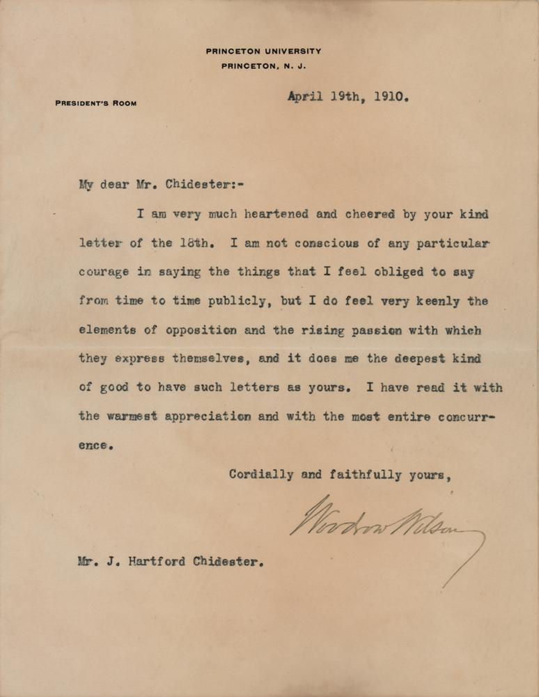TLS, one page, 6 x 7.75, Princeton University letterhead, April 19, 1910. Letter to J. Hartford Chidester, in full: “I am very much heartened and cheered by your kind letter of the 18th. I am not conscious of any particular courage in saying the things that I feel obliged to say from time to time publicly, but I do feel very keenly the elements of opposition and the rising passion with which they express themselves, and it does me the deepest kind of good to have such letters as yours. I have read it with the warmest appreciation and with the most entire concurrence.” In fine condition, with some faint toning.