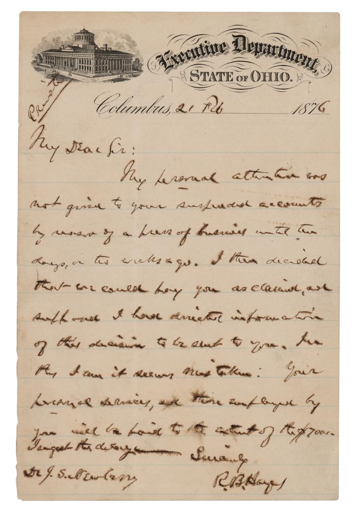 ALS as governor, signed “R. B. Hayes,” one page, 5.5 x 8.25, Executive Department, State of Ohio letterhead, February 21, 1876. Handwritten letter from Rutherford B. Hayes marked “Private,” sent to Dr. J.S. Newberry, concerning payment for his services, in part: “My personal attention was not given to your suspended accounts by reason of a press of business?Your personal services, not those employed by you will be paid to the extent of the $700.” In fine condition.