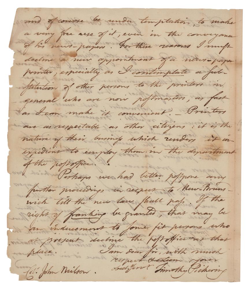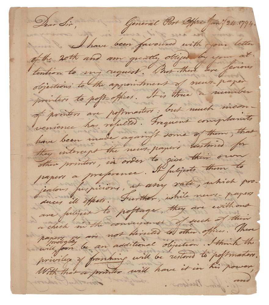 ALS, one page both sides, 8 x 9.25, January 24, 1794. Addressed from the “General Port Office,” an interesting handwritten letter from Timothy Pickering sent to Col. John Neilson of New Jersey regarding the appointing of newspaper printers as postmasters, in part: “I have been favoured with your letter of the 20th and am greatly obliged by your attention to my request. But there are serious objections to the appointment of news-paper printers to post-offices. It is true a number of printers are postmasters: but much inconvenience has resulted. Frequent complaints have been made against some of them, that they intercept the news-papers destined for other printers, in order to give their own papers a preference. It subjects them to jealous suspicions, at any rate, which produces ill effects. Further, while news-papers are subject to postage, they are without a check in the conveyance of such of their papers as are not directed to other offices. There will probably soon be an additional objection. I think the privilege of franking will be restored to postmasters. With that a printer will have it in his power, and of course be under temptation to make a very free use of it, even in the conveyance of his news-papers. For these reasons I must decline a new appointment of a news-paper printer; especially as I contemplate a substitution of other persons to the printers in general who are now postmasters, as fast as I can make it convenient. Printers are as respectable as other citizens: it is the nature of their business which renders it inexpedient to employ them in the department of the post office.” In very good to fine condition, with edge wear, and some light staining.