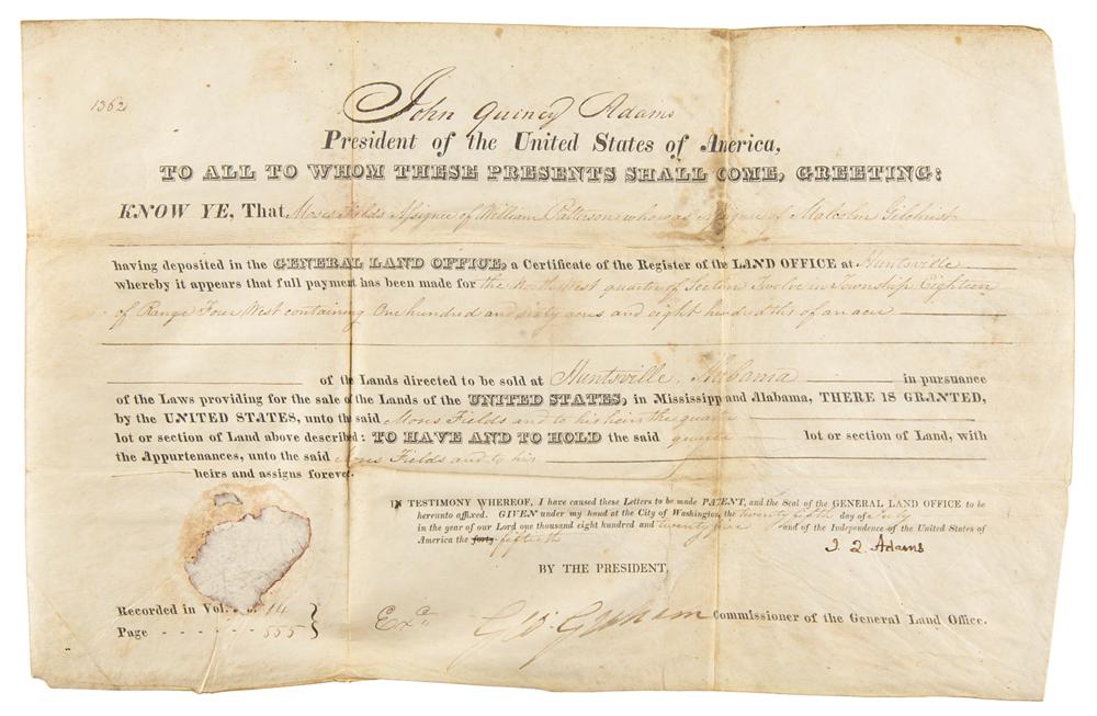 Partly-printed vellum DS as president, signed “J. Q. Adams,” one page, 13.75 x 8.75, July 25, 1825. President Adams grants Moses Fields a tract "containing One hundred and sixty acres and eight hundredths of an acre?of the Lands directed to be sold at Huntsville, Alabama." Boldly signed at the conclusion by President John Quincy Adams and countersigned by Commissioner of the General Land Office George Graham. In very good to fine condition, with light soiling, staining, and a missing seal.