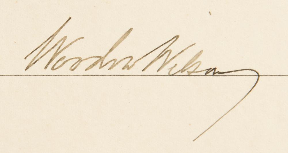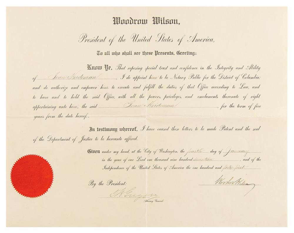 World War I-dated partly-printed DS, one page, 17.25 x 13.5, January 4, 1917. President Wilson appoints Ivan Heideman as a “Notary Public for the District of Columbia.” Signed nicely at the conclusion by Woodrow Wilson and countersigned by Attorney General Thomas W. Gregory. The embossed Department of Justice seal remains affixed to the lower left. In fine condition, with intersecting folds.