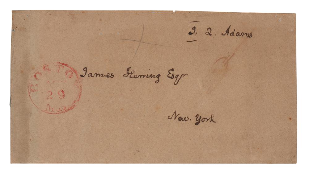 Hand-addressed and free-franked mailing panel, 6.5 x 3, addressed by John Quincy Adams to the portrait painter and engraver “James Herring Esqr, New York," and franked in the upper right, "J. Q. Adams." In very good to fine condition, with light show-through along the left edge from an old mounting strip on the back.