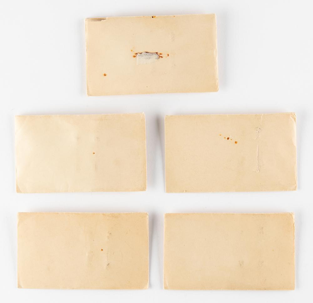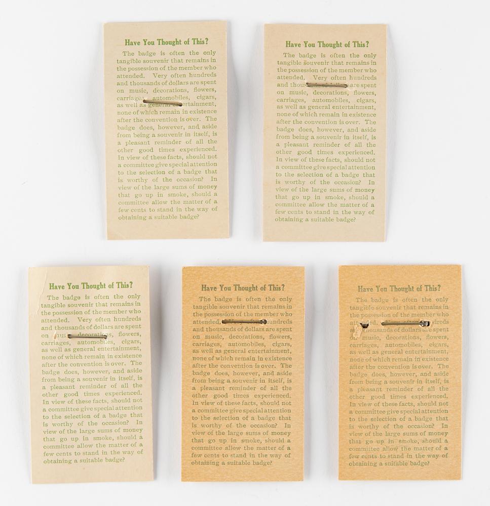 Group of five press badges issued for the 1932 Los Angeles Olympic Games. Bronze, 40 mm x 40 mm, 13 gm, manufactured by Whitehead & Hoag of Newark. The badges feature the Olympics rings over a shield and laurel branch, with “Xth Olympiad Los Angeles” above, and engraved tablet below, “Press.” Suspended below the are small yellow and red ribbons, all with "Not Good for Admittance" labels to reverse. All retain their original Whitehead & Hoag cardboard backers, and are housed in their original paper envelopes. Badges with bronze medallions were issued to team managers, athletes and attendants, and to the press.