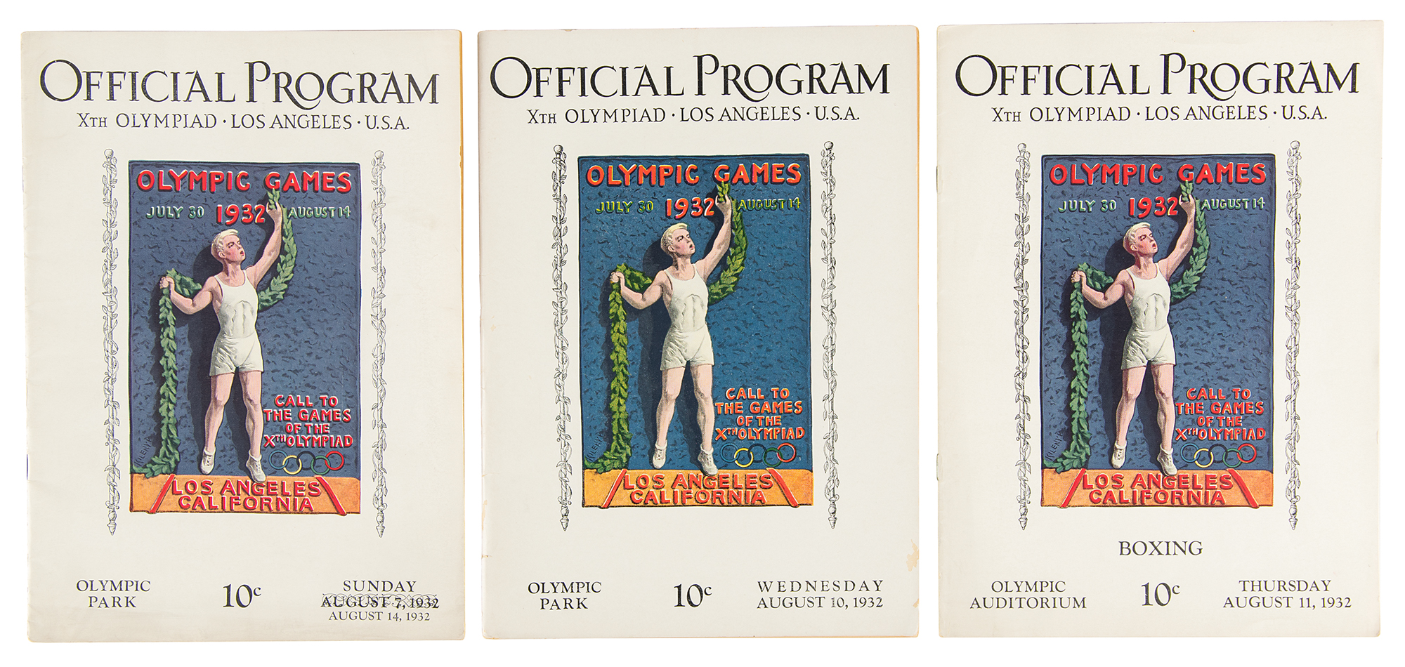 Three daily programs for the Los Angeles 1932 Summer Olympics, each 7.5 x 10.5, for the dates of August 10, August 11, and August 14 (with "August 7" overprinted on cover). The first program covers the gymnastics, fencing, swimming, rowing, boxing, equestrian, and yachting events of the day; the second covers boxing and provides results from other sporting events; and the last provides a recap of the Games as a whole and covers the closing ceremonies. In overall fine condition, with minor wear.