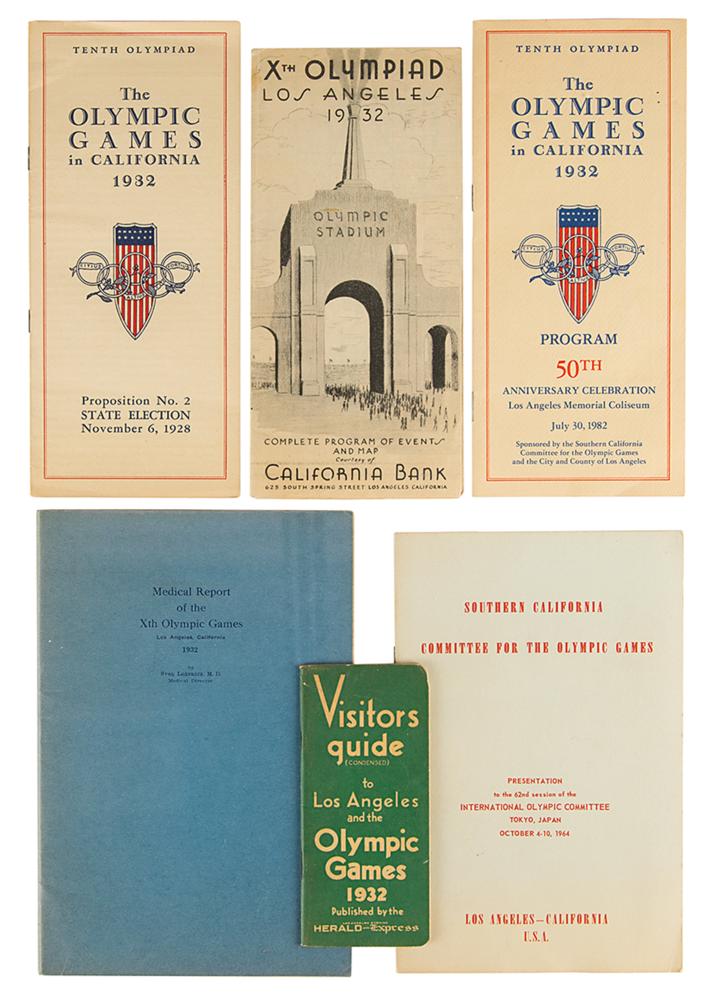 Six booklets affiliated with the Los Angeles 1932 Summer Olympics, including: a pocket visitor's guide to Los Angeles and the Olympic Games, published by the Herald and Express; a program of events published by the California Bank; a brochure in support of "Proposition No. 2" in California's 1928 state election, which would raise funds for the Games; a booklet for the presentation by the Southern California Committee for the Olympic Games at the 62nd IOC session in Tokyo in 1964; a medical report of the Xth Olympic Games by Sven Lokrantz; and a program for the 50th anniversary celebration held in 1982. In overall fine condition.