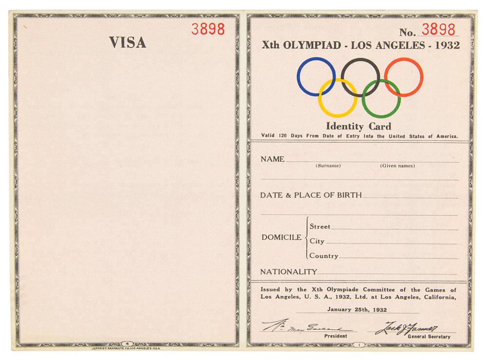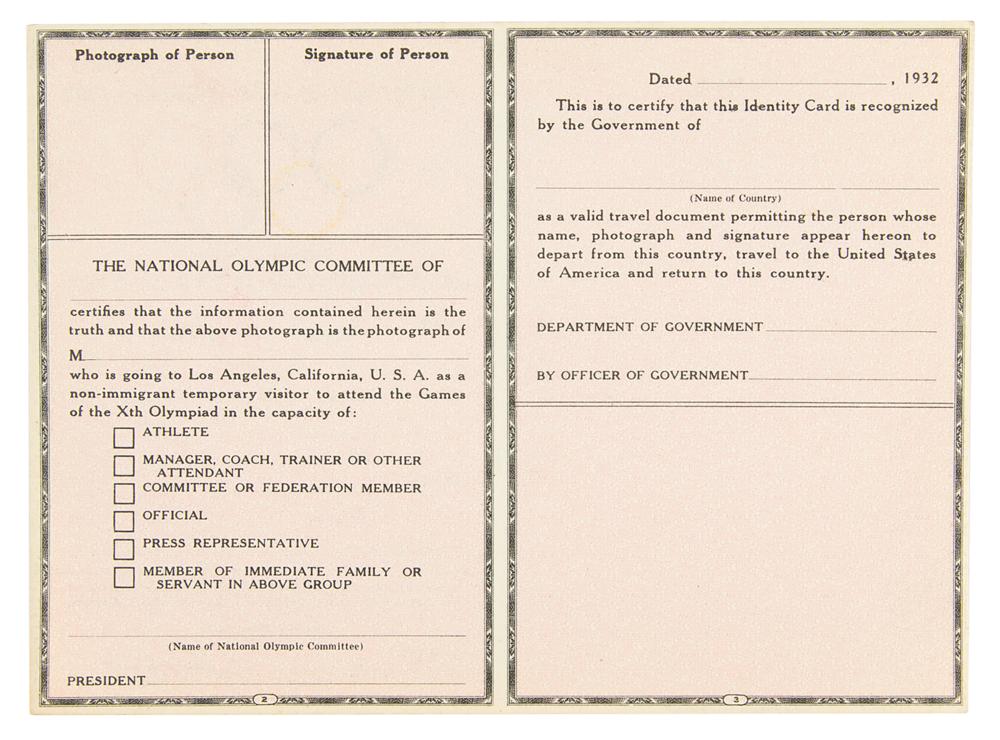 Large lot of 82 blank identification cards produced for the Los Angeles 1932 Summer Olympics, 7 x 5.25, with areas on the front for name, date and place of birth, address, nationality, and visa stamps. The reverse features areas for a passport-style photo, signature, participant category (athlete, manager/coach, committee member, official, press, or family), and government's certification of identity. In overall fine condition, with several in lesser condition due to tears or bends.