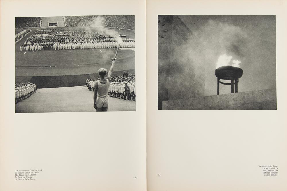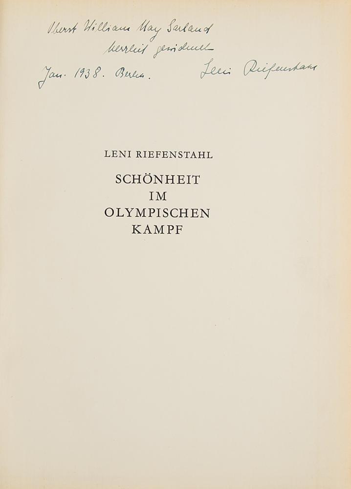 Signed book: Schonheit im Olympischen Kampf [Beauty in the Olympics]. First edition. Berlin: Im Deutschen Verlag, 1937. Hardcover, 9.5 x 12.5, 281 pages. Signed and inscribed on the half-title page in fountain pen to the IOC member who brought the 1932 Games to Los Angeles, "Oberst William May Garland…Leni Riefenstahl, Jan. 1938, Berlin." The art book is heavily illustrated with full-page gravures of Riefenstahl's photographs of the Berlin 1936 Summer Olympics, beautifully portraying the athletes, ceremonies, and venues. In fine condition.