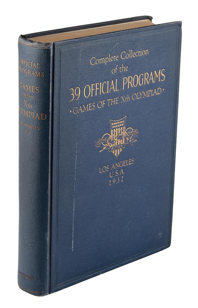 Fantastic complete bound set of the 39 official programs of the Los Angeles 1932 Summer Olympics. Hardcover bound in blue cloth with gilt lettering, "Complete Collection of the 39 Official Programs, Games of the Xth Olympiad, Los Angeles, U.S.A., 1932," 8 x 11, printed by the Times-Mirror Printing & Binding House, Los Angeles. Book condition: VG/None, with light edgewear, bumped corners, and some scuffing to boards.