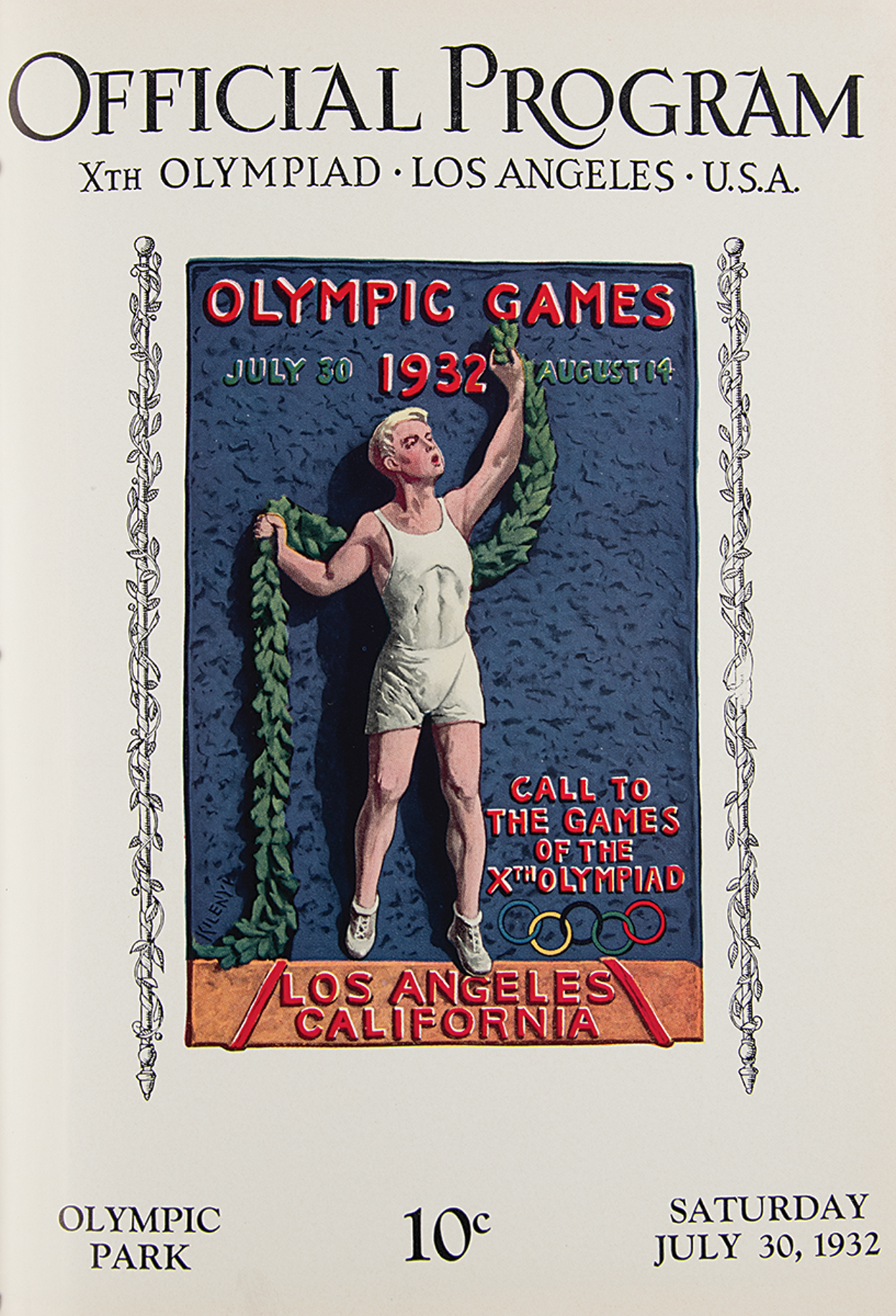 Fantastic complete bound set of the 39 official programs of the Los Angeles 1932 Summer Olympics. Hardcover bound in blue cloth with gilt lettering, "Complete Collection of the 39 Official Programs, Games of the Xth Olympiad, Los Angeles, U.S.A., 1932," 8 x 11, printed by the Times-Mirror Printing & Binding House, Los Angeles. Book condition: VG/None, with light edgewear, bumped corners, and some scuffing to boards.