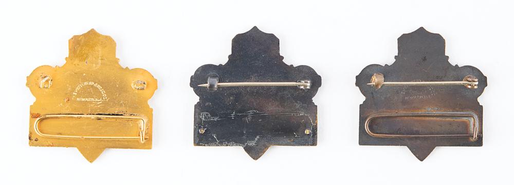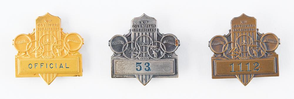 Three scarce badges issued for the 1932 Los Angeles Olympic Games, all with ribbons absent, featuring variants in gold, silver, and bronze, 40 mm x 40 mm, 13 gm, manufactured by Whitehead & Hoag of Newark. The badges features the Olympics rings over a shield and laurel branch, with “Xth Olympiad Los Angeles” above, and engraved tablet below: the gold badge reads “Official”; the silver team chef de mission badge is numbered "53"; and the bronze athlete's badge is numbered "1112." A desirable group representing three badge types distributed to athletes and officials during the Los Angeles 1932 Summer Olympics.