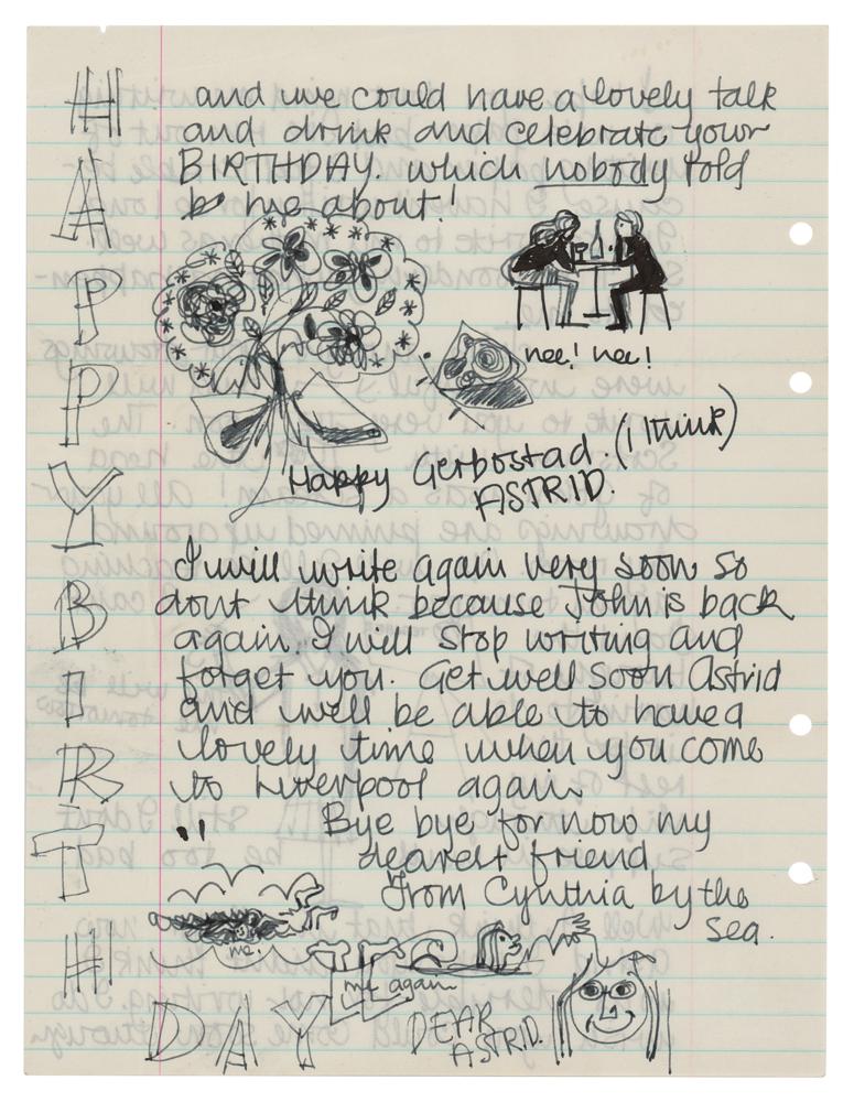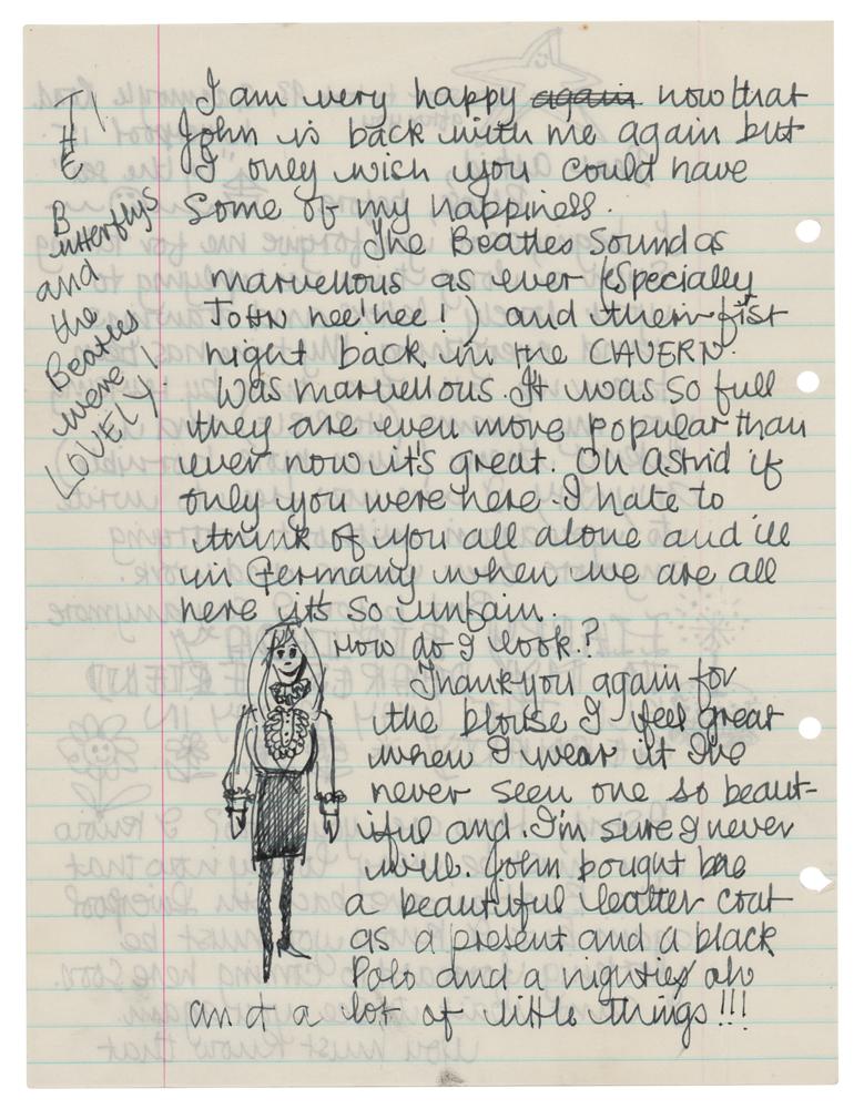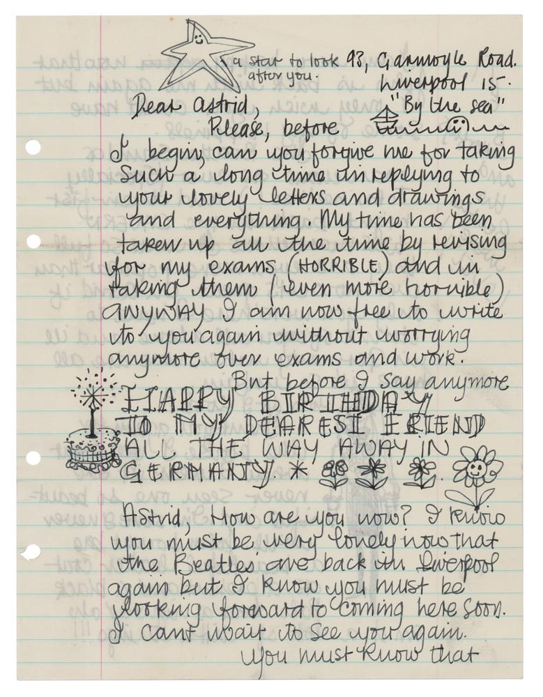 The letter, in part; “Please, before I begin, can you forgive me for taking such a long time in replying to your lovely letters and drawings and everything?But before I say any more HAPPY BIRTHDAY TO MY DEAREST FRIEND ALL THE WAY AWAY IN GERMANY. Astrid, how are you now? I know you must be very lonely now that the Beatles are back in Liverpool again but I know you must be looking forward to coming here soon. I can’t wait to see you again. You must know that. I am very happy now that John is back with me again but I only wish you could have some of my happiness.