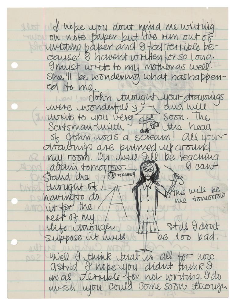 Fabulous ALS, signed “Cynthia by the sea,” four total pages, 7.5 x 9.75, postmarked June 13, 1962. Addressed from Liverpool, a warm and lengthy handwritten letter from Cynthia Powell to her friend, noted Beatles photographer, Astrid Kirchherr. In addition to discussing her reunion with John Lennon and the Beatles, who had frequently returned from Germany, Powell fills her letter with numerous wonderful small sketches of herself, Astrid, a tree, a star, flowers, a birthday cake, and more.