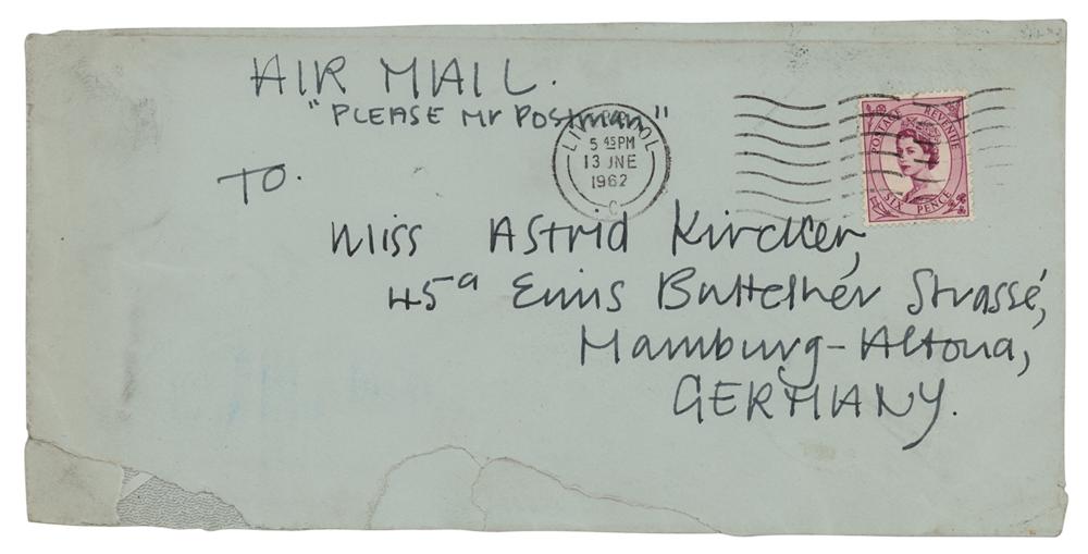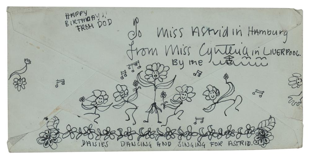 The Beatles sound as marvellous as ever (especially John hee! hee!) and their first night back in the CAVERN was marvellous. It was so full they are even more popular than ever now it’s great. Oh Astrid if only you were here. I hate to think of you all alone and in Germany when we are all here it’s so unfair?John bought me a beautiful leather coat as a present and black polo and a nighty and a lot of little things!!!?John thought your drawings were wonderful and will write to you very soon. The Scotsman with the head of John was a scream! All your drawings are pinned up around my room?I will write again very soon so don’t think because John is back again I will stop writing and forget you.” In fine condition. Accompanied by the original mailing envelope addressed by Powell, who signs again, “To Miss Astrid in Hamburg, from Miss Cynthia in Liverpool by the [sea],” and adds wonderful dancing flower sketches on the reverse and writes: “Daisies dancing and singing for Astrid.” Shortly after the couple learned they were to have a child, Powell and Lennon were married on August 23, 1962, at the Mount Pleasant register office in Liverpool, roughly two months after Powell wrote this letter.