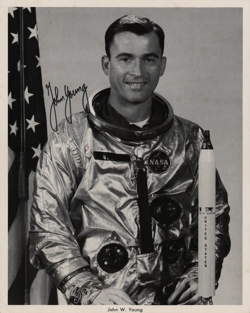 Official 8 x 10 NASA lithograph of John Young posing in his Gemini space suit next to a rocket model, signed in black felt tip. In fine condition, with scattered small creases.