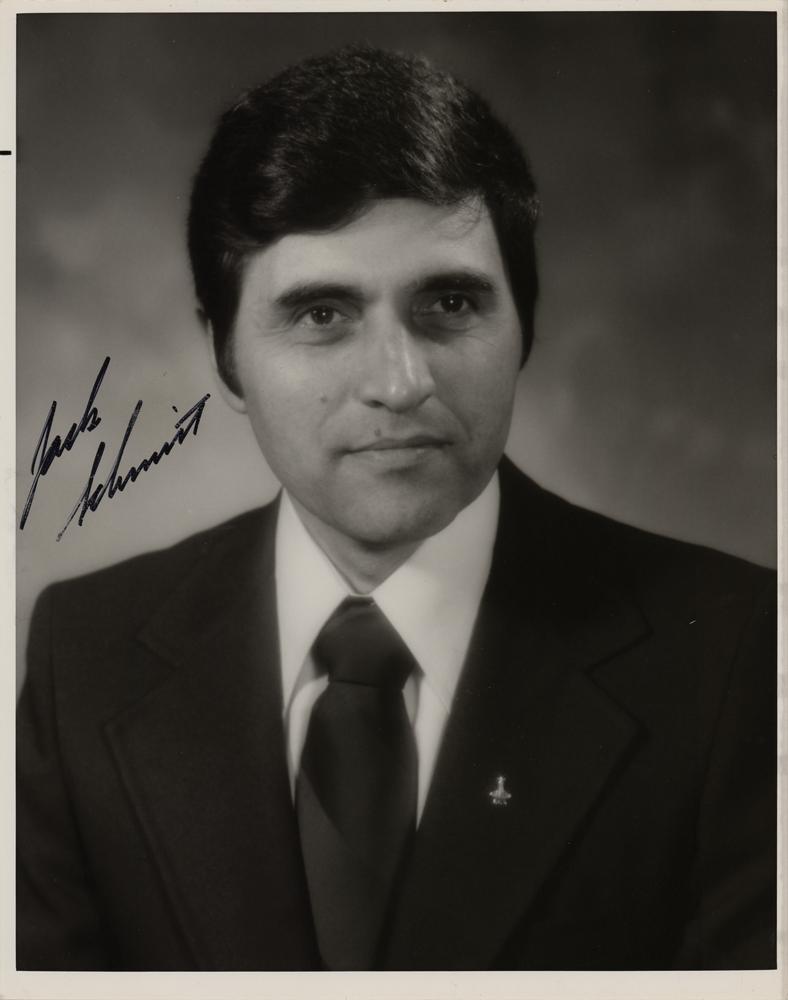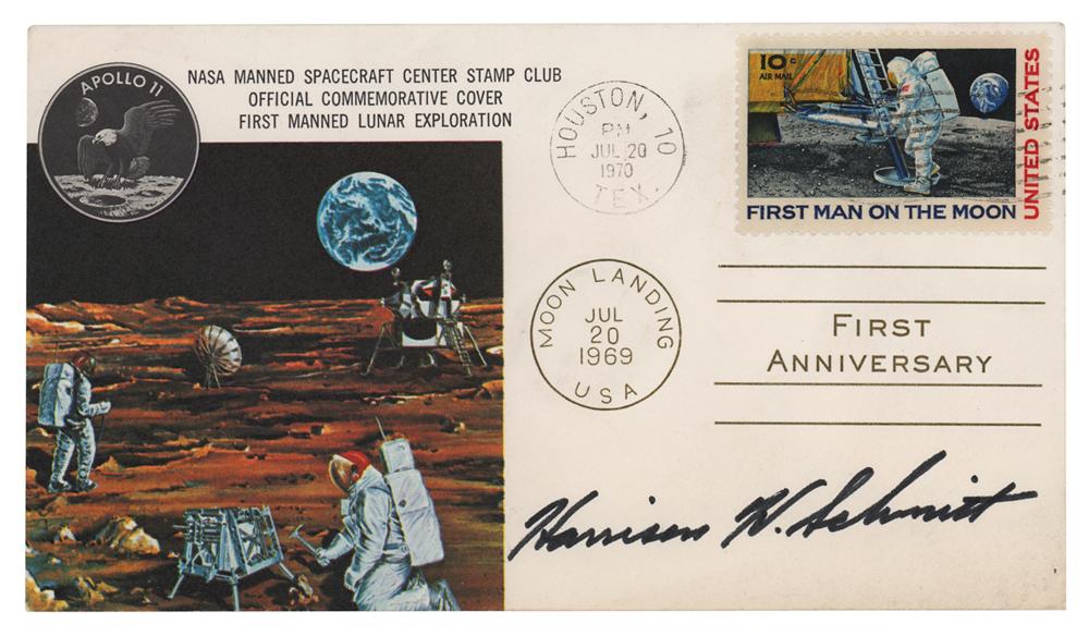 Two items signed in black felt tip: an official glossy 8 x 10 NASA portrait photo, signed “Jack Schmitt,” the reverse bearing “This Paper Manufactured by Kodak” watermarks; and an Apollo 11 ‘First Anniversary' commemorative cover with correlating postmarks, signed “Harrison H. Schmitt.” In overall fine condition.