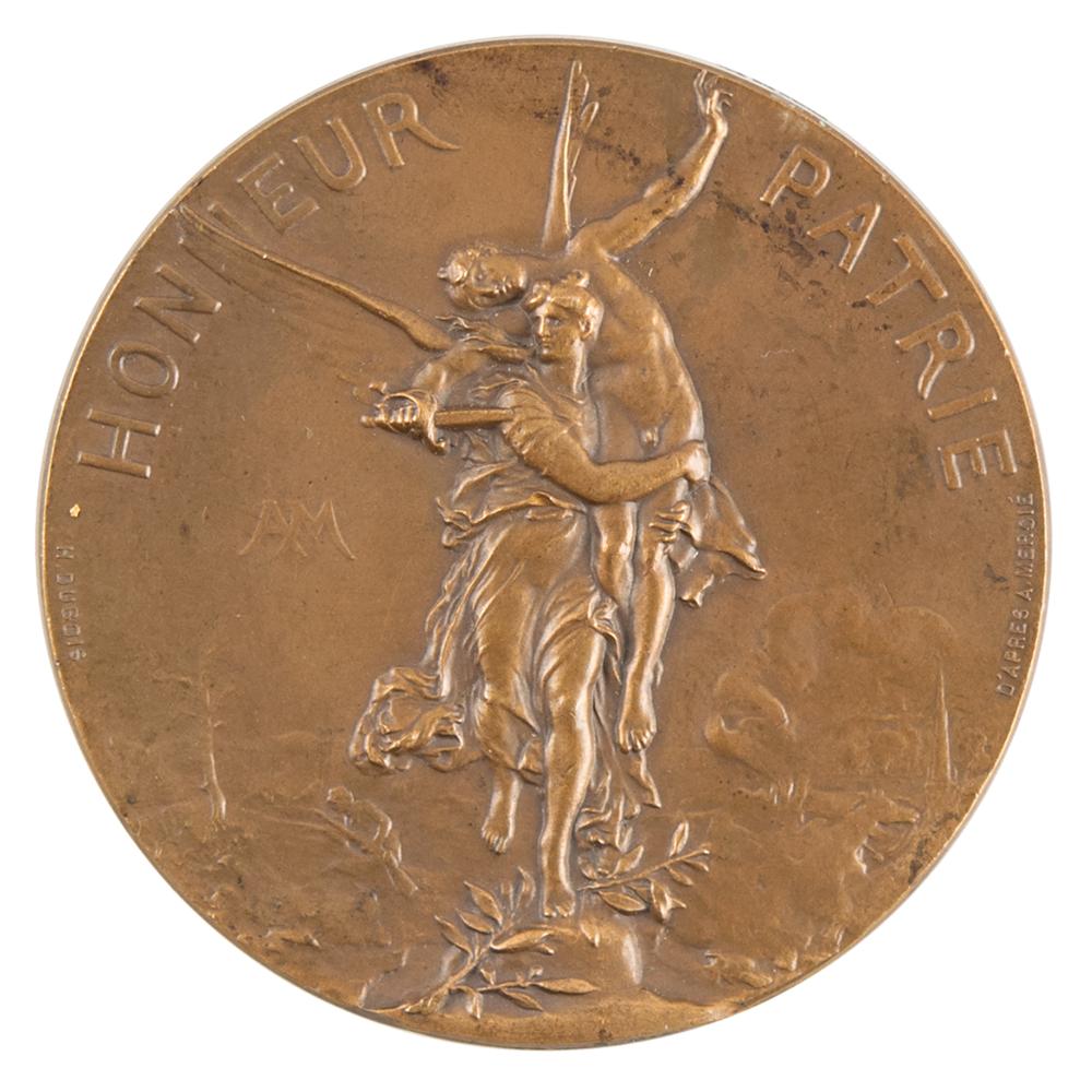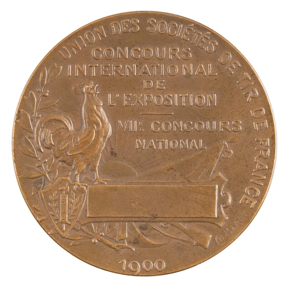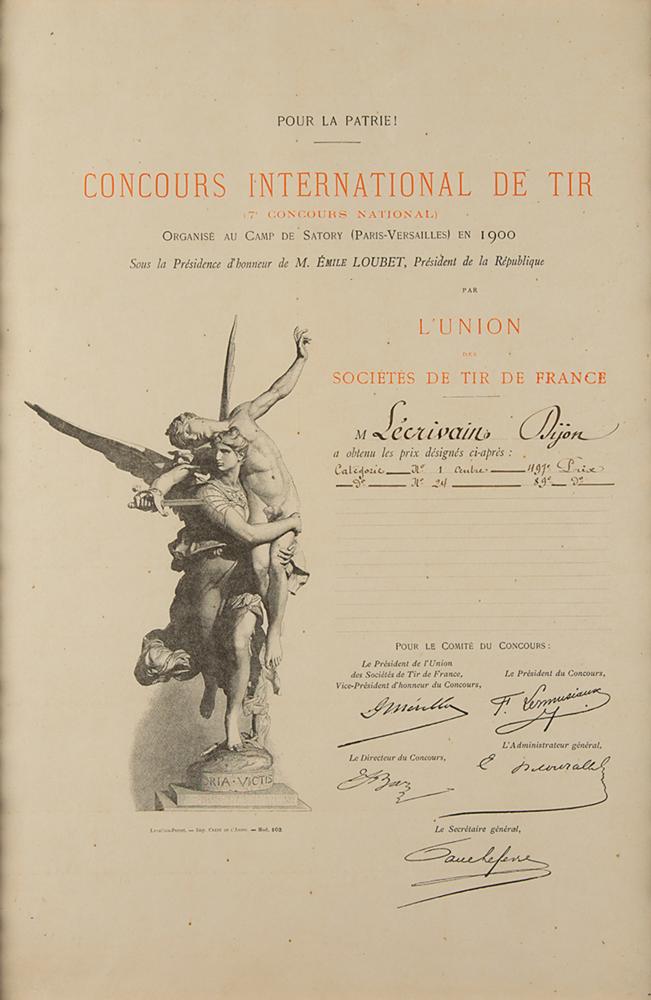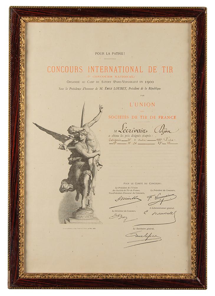 Desirable participant's diploma issued for the shooting events held as part of the Paris 1900 Olympics, one page, 12 x 18, featuring the facsimile signatures of the shooting competition committee. The diploma is filled out as issued to "Lecrivain Dijon," and framed to an overall size of 14.5 x 20.5. Includes a bronze medal issued by the Union des Sociétés de Tir de France [Union of Shooting Societies of France], 45 mm, 45 gm, featuring an image of Victory rising, carrying an armed man, inscribed "Honneur Patrie," on the reverse, with "Concours International de L'Exposition Vii Concours National" on the reverse. The medal includes its hinged case.
