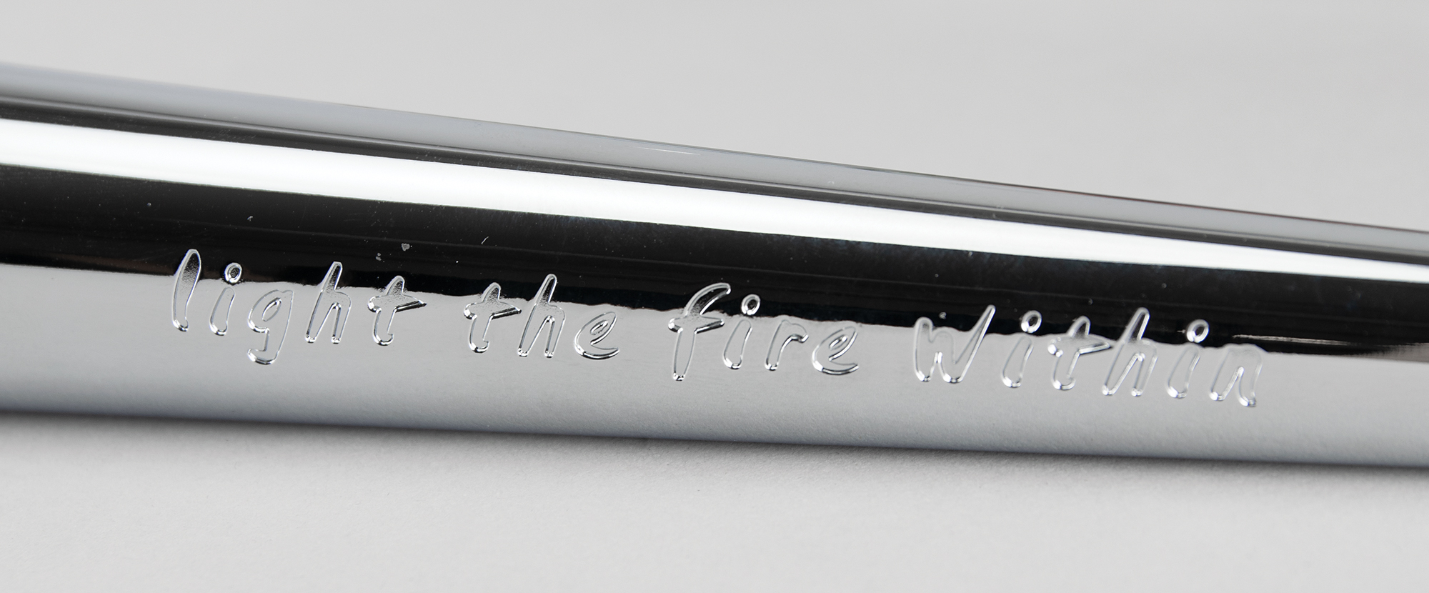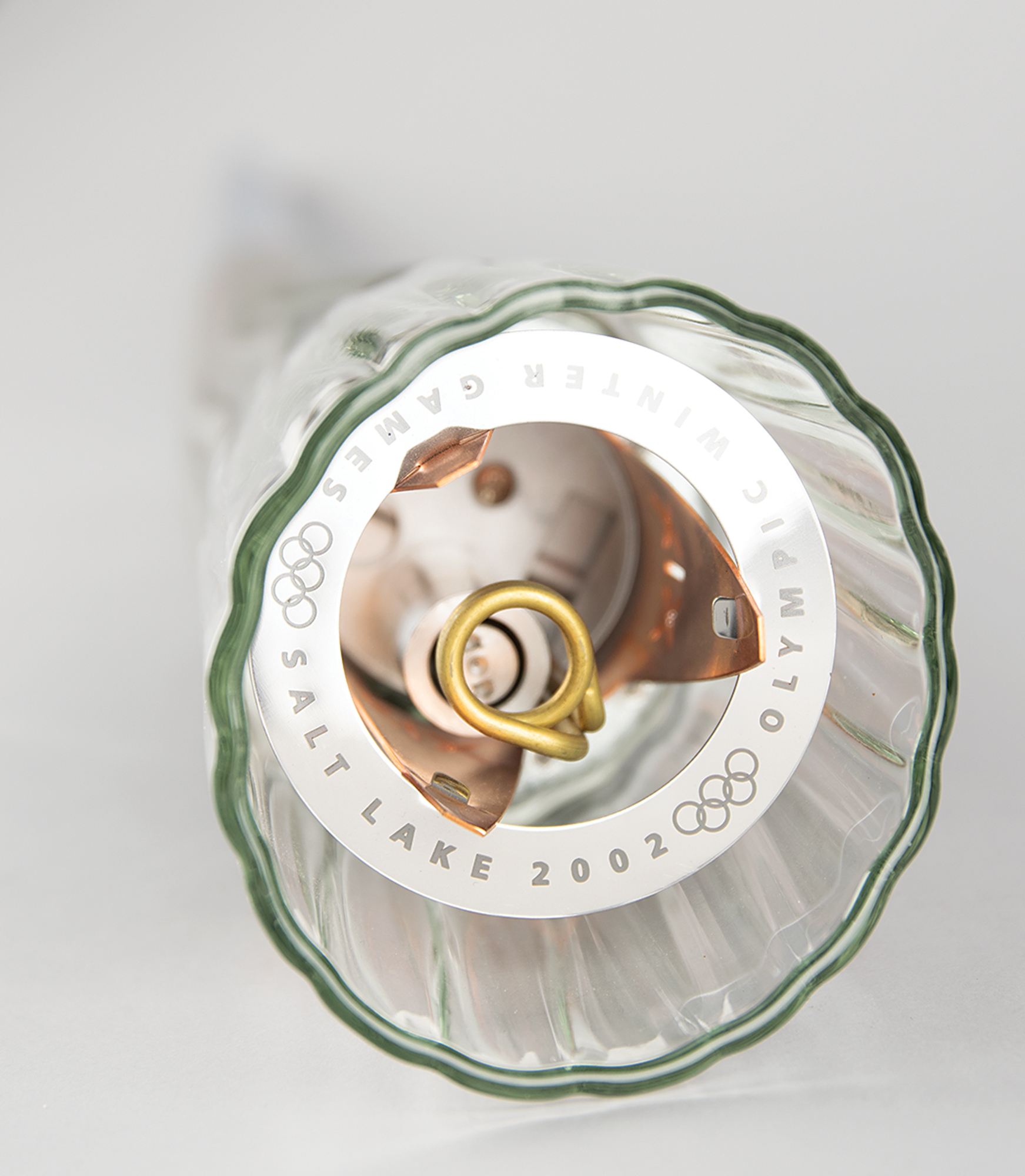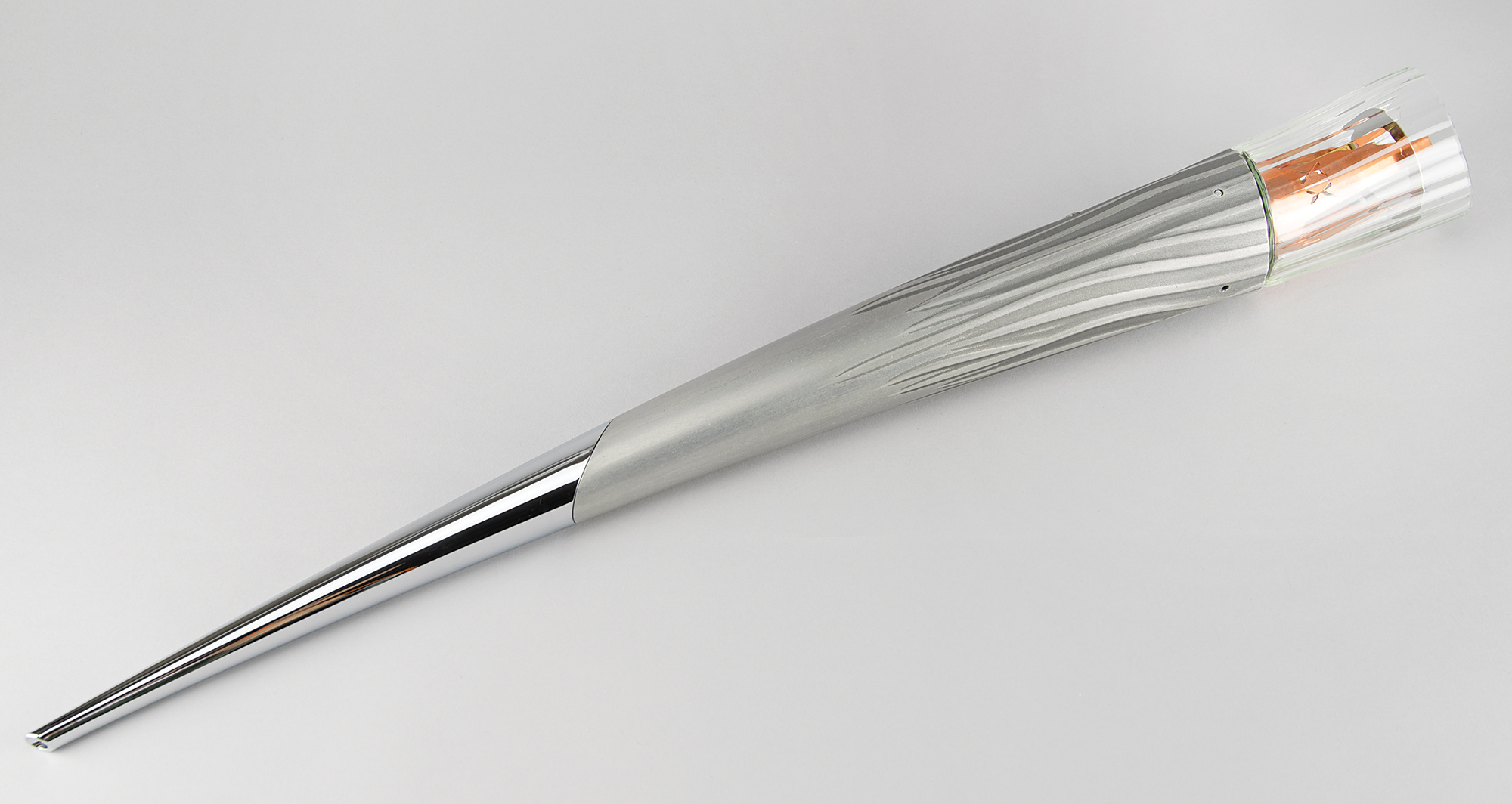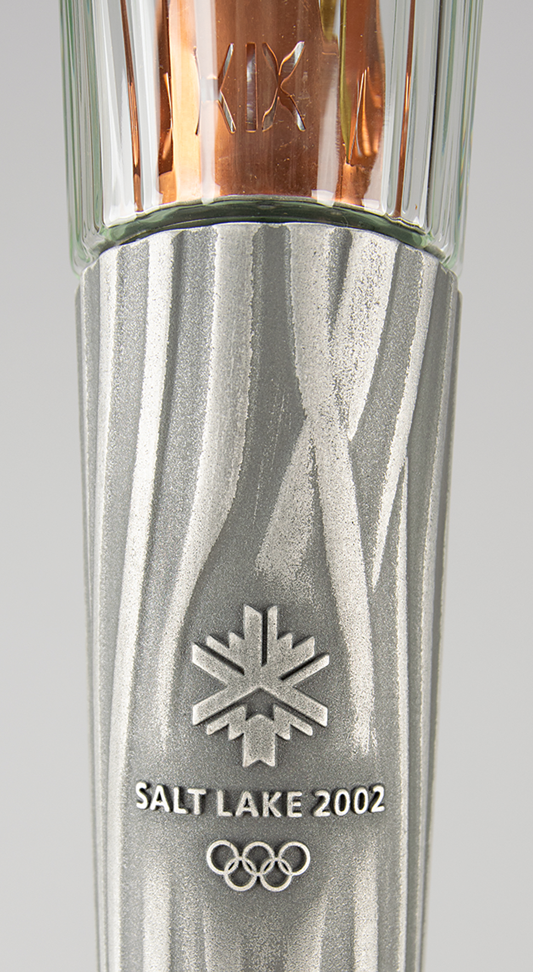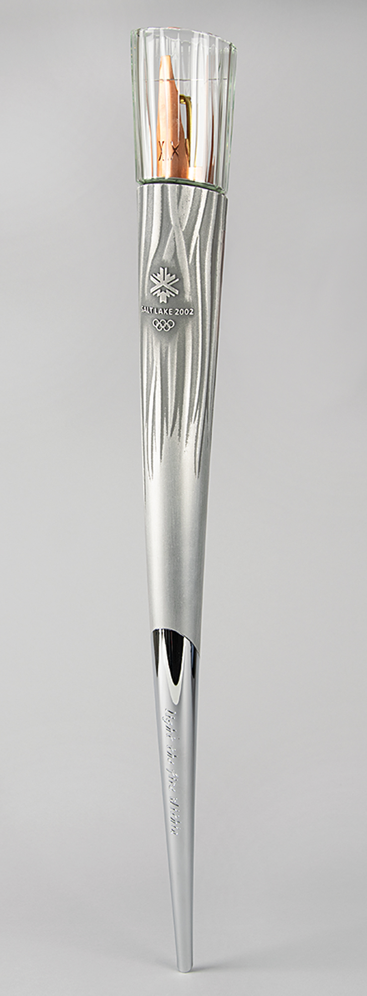 Unused official 2002 Salt Lake City Winter Olympics torch, constructed of silvered metal and copper, measuring 31.5″ in length and 3.5″ at its widest point, designed by Axiom Design and manufactured by Coleman. The torch was modeled after an icicle and slightly curved to represent speed and fluidity, with a contrasting dull and polished finish on the handle to represent the meeting of modernity with the past. The handle, which bears trivial scuffs, is engraved with the motto of the games, "Light the fire within," and a raised emblem of the games appears near the top. A desirable example as it is complete with its fragile glass bowl.