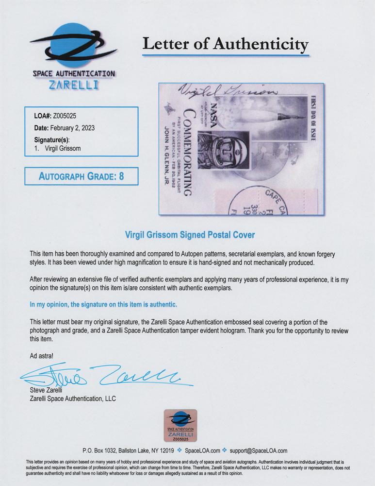 FDC with a cachet honoring the first orbital flight made by John Glenn, signed vertically in black ink by his Mercury mission predecessor, "Virgil I. Grissom." In very fine condition. Accompanied by a full letter of authenticity from Zarelli Space Authentication.