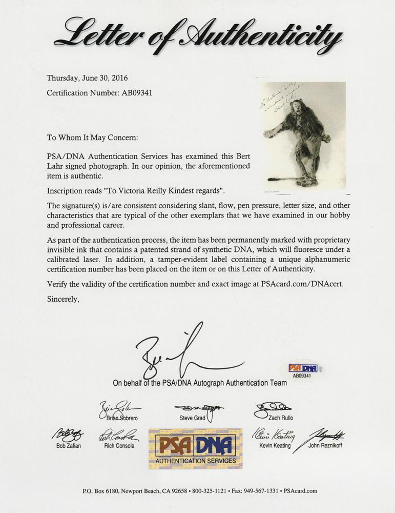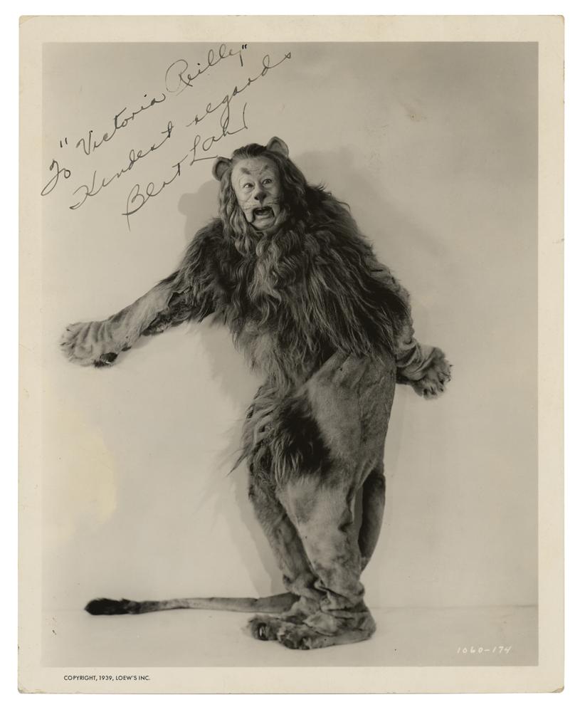 Spectacular vintage pearl-finish 8 x 10 Loew's Inc. publicity photo of Lahr in full costume and makeup as the Cowardly Lion for the classic 1939 film The Wizard of Oz, neatly signed and inscribed in fountain pen, "To 'Victoria Reilly,' Kindest regards, Bert Lahr.” Reverse bears a typed press caption entitled "The Cowardly Lion Who Seeks Courage." In fine condition. Accompanied by a full letter of authenticity from PSA/DNA. The recipient, Victoria Reilly, was a dancer and wardrobe stylist who amassed a large collection of signed photographs from stars of stage and film during the early-to-mid 1940s. Vintage photos signed by Lahr as the Cowardly Lion are virtually nonexistent; those that have emerged tend to be signed with ballpoint in the 1960s and sent out after Lahr's passing. This fountain pen-signed example exists as a true vintage rarity of Oz memorabilia.