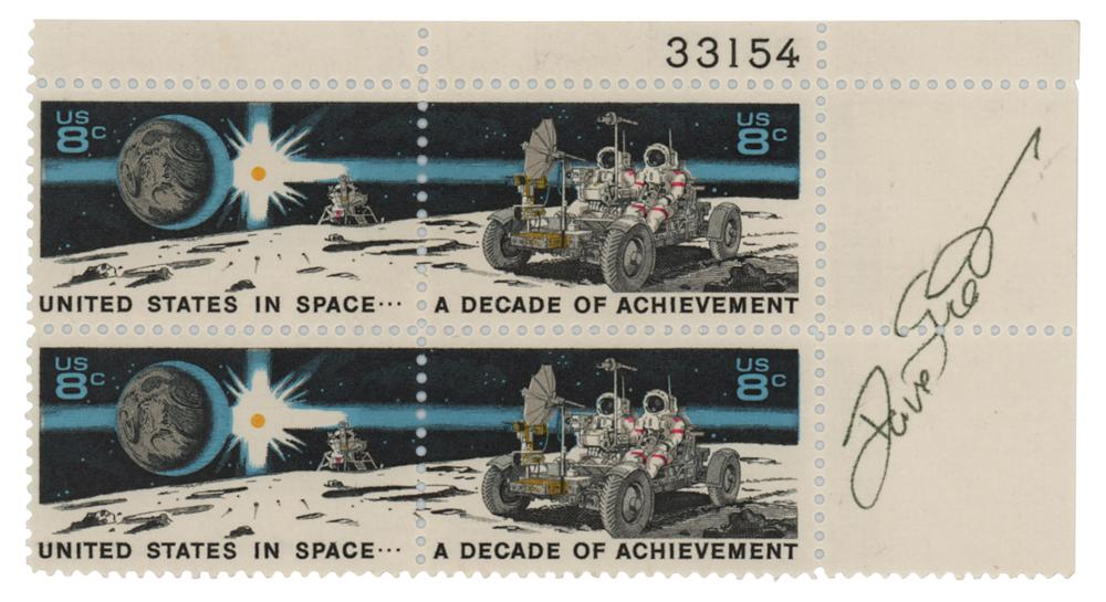 Block of four 8-cent 'United States in Space: A Decade of Achievement' stamps, 4.25 x 2.25, signed in black ink by Dave Scott. In very fine condition.