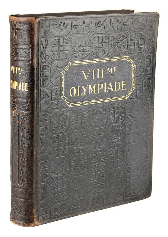 Uncommon official report in French: Les Jeux de la VIIIe Olympiade Paris 1924: Rapport Officiel [The Games of the VIII Olympiad Paris 1924: Official Report]. First edition. Paris: Librairie de France, 1925. Hardcover bound in black textured cloth with gilt-stamped title, 10.25 x 12.75, 852 pages. Book condition: VG/None, with edgewear, rubbing, and fraying to corners.