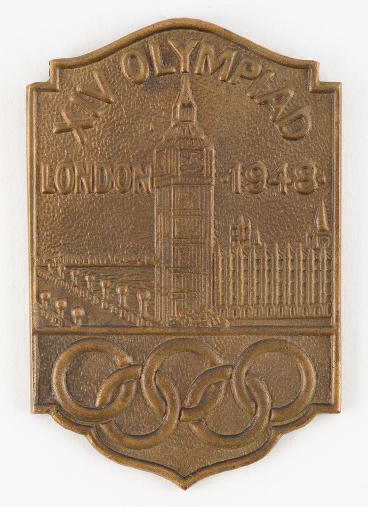 Uncommon commemorative plaquette issued for the London 1948 Summer Olympics. Bronze, 64 mm x 102 mm, 91 gm, the front depicting the bridge and palace of Westminster over the Olympics rings and below raised text, "XIV Olympiad, London 1948,” and the reverse showing the raised image of a discus thrower standing on a podium numbered “851108.”