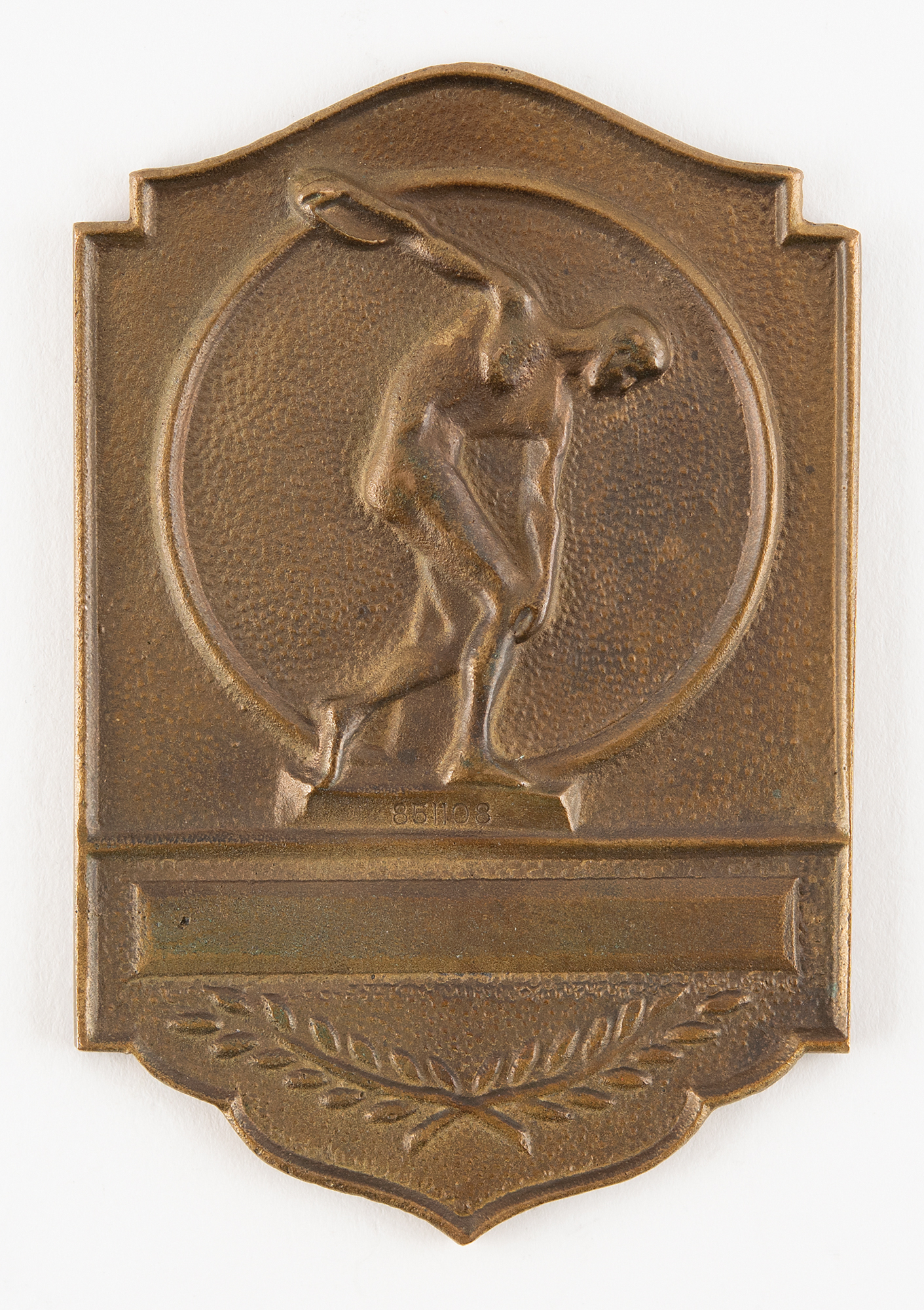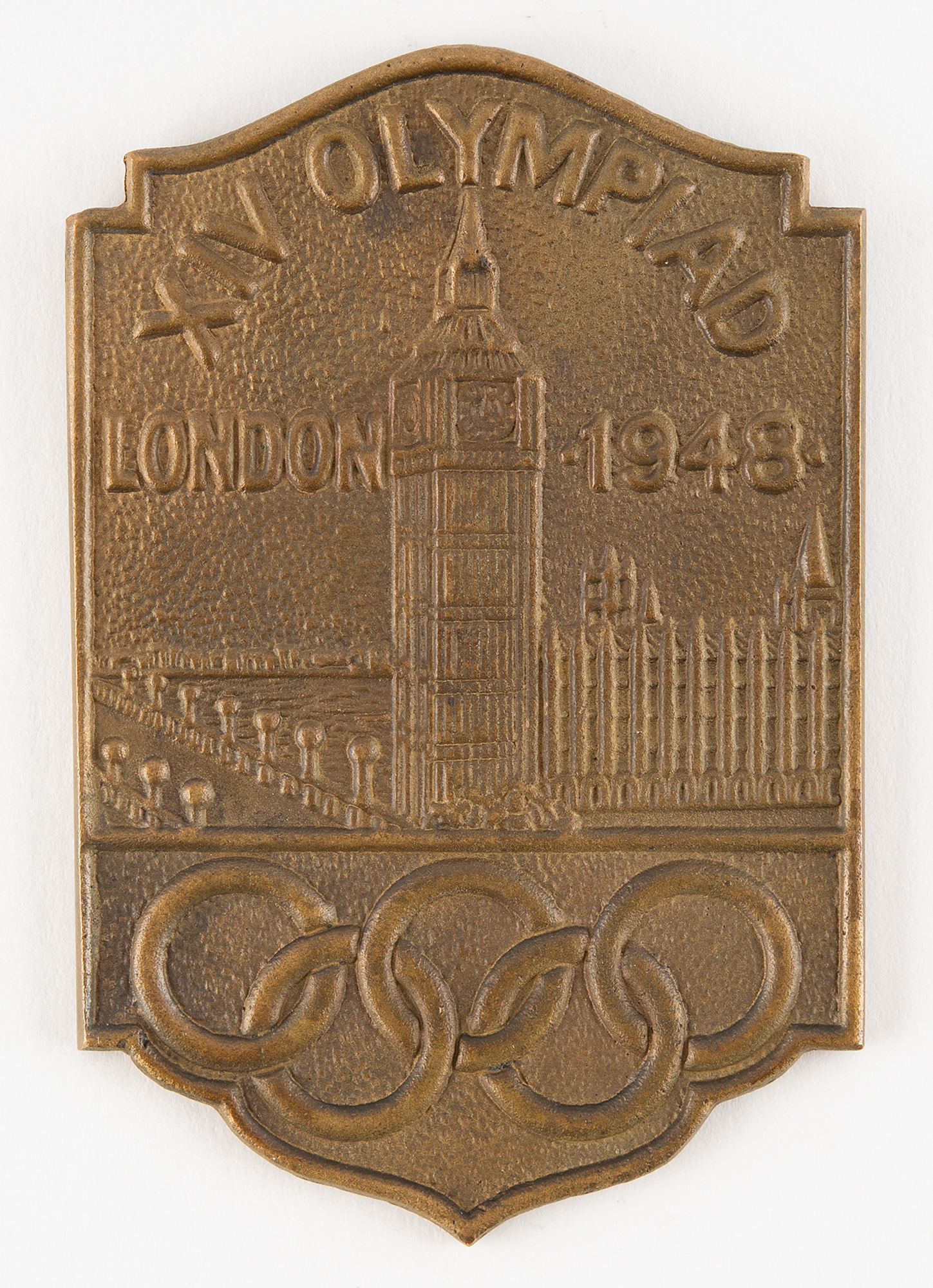 Uncommon commemorative plaquette issued for the London 1948 Summer Olympics. Bronze, 64 mm x 102 mm, 91 gm, the front depicting the bridge and palace of Westminster over the Olympics rings and below raised text, "XIV Olympiad, London 1948,” and the reverse showing the raised image of a discus thrower standing on a podium numbered “851108.”