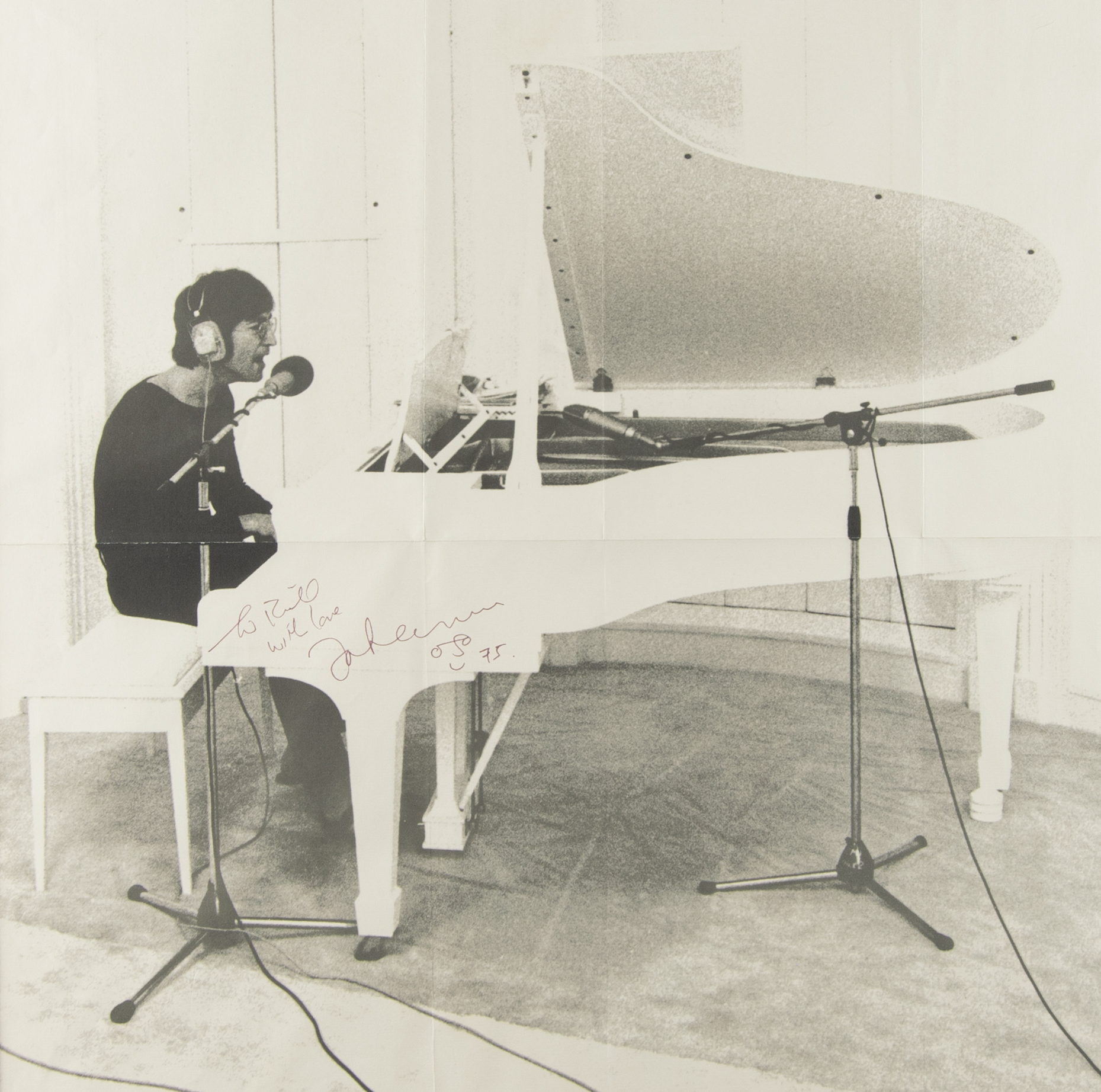 Fantastic original poster included in Lennon’s iconic Imagine album, 22 x 33, signed and inscribed in black felt tip, "To Bill, with love, John Lennon, 75." Lennon has also drawn his famous self-portrait caricature below the autograph. The classic image shows John Lennon solo, singing at his grand piano. Framed and in fine condition, with expected intersecting folds. An uncommon and highly desirable oversized format.