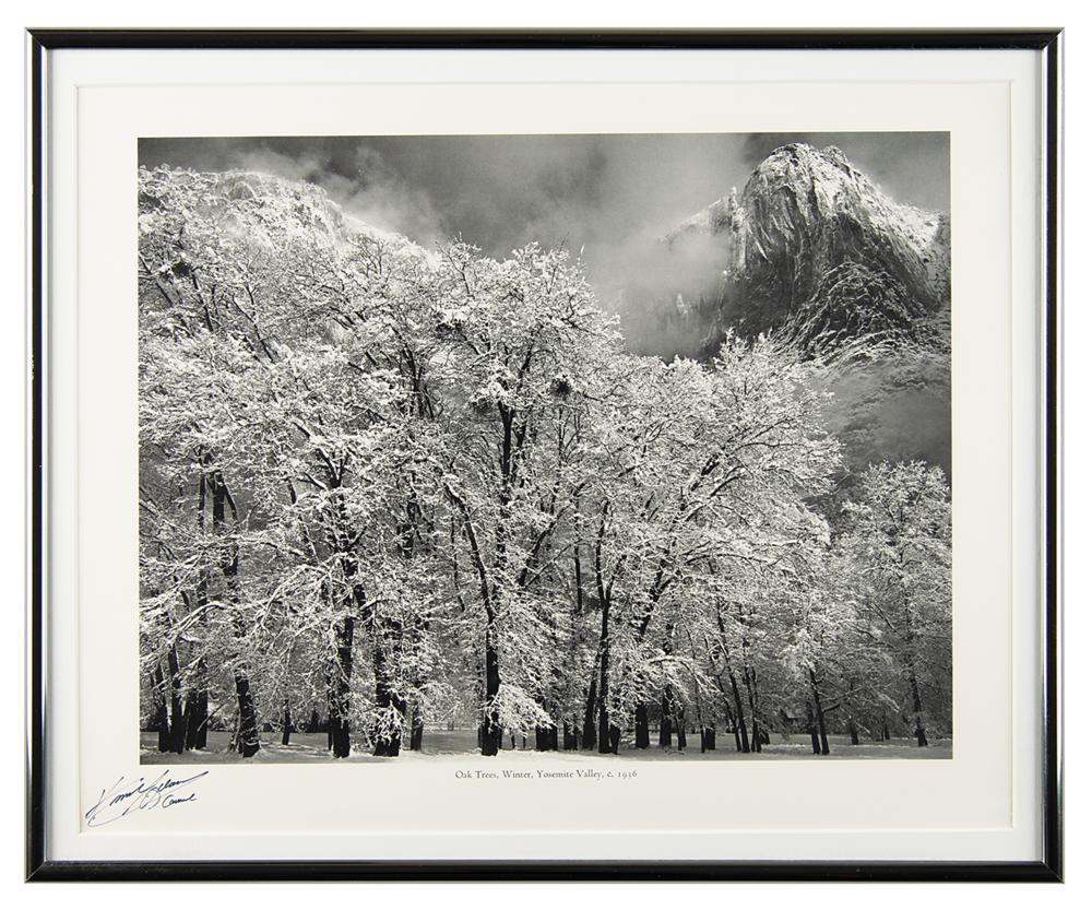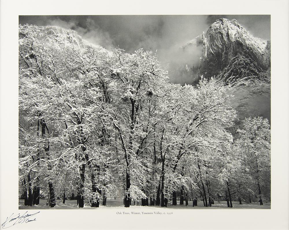 Handsome 15 x 12 print of 'Oak Trees, Winter, Yosemite Valley, c. 1936,' signed in the lower left in black felt tip, "Ansel Adams, Carmel." Matted and framed to an overall size of 16.5 x 13.75. In fine condition.