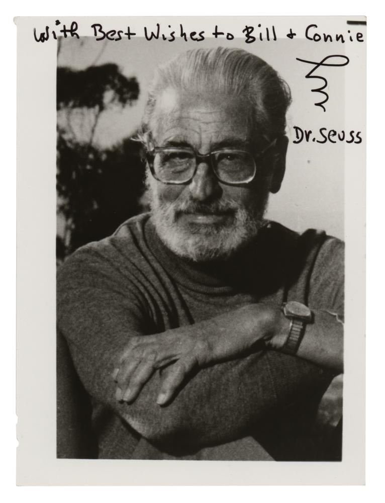 Glossy 3.75 x 5 head-and-shoulders photo of the celebrated children's author and cartoonist, signed and inscribed in black felt tip, "With best wishes to Bill & Connie, Dr. Seuss.” In fine condition.