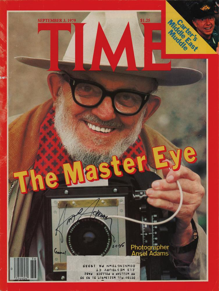 Cover from the September 3, 1979 issue of Time Magazine, 8 x 11, signed in black felt tip by Ansel Adams. In very good to fine condition, with scattered light creasing, and a few short edge tears.