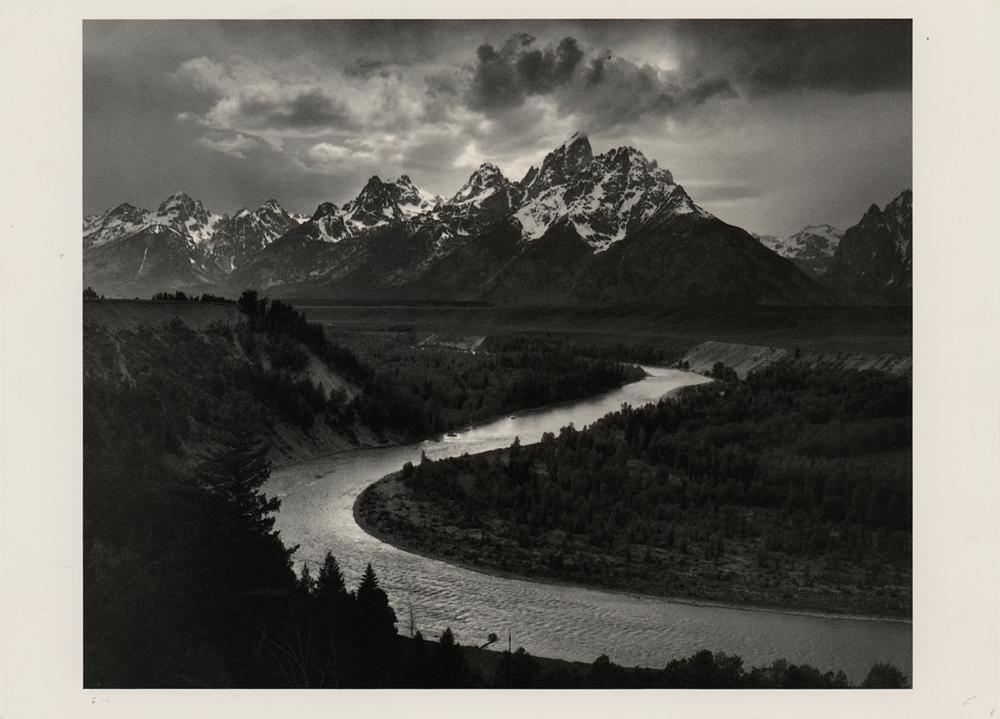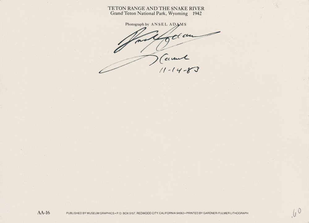 Attractive 7 x 5 postcard featuring ‘Teton Range and the Snake River’ in Grand Teton National Park, signed on the reverse in black felt tip by the photographer, "Ansel Adams, Carmel, 11-14-83." In fine condition.