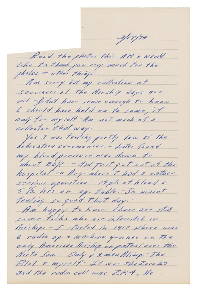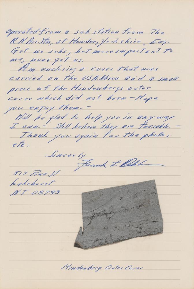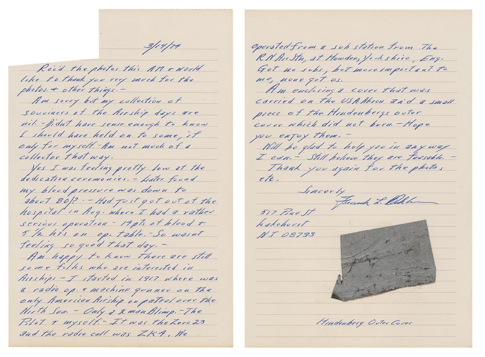 Sizable 3 x 1.75 swatch of the silver-colored hull of the LZ 129 Hindenburg, which caught fire when it attempted to dock with its mooring mast at Naval Air Station Lakehurst in Manchester Township, New Jersey on May 6, 1937. The swatch is affixed to the second page of a handwritten letter from a retired NS class airship pilot, dated March 14, 1974, in part: “Am sorry but my collection of my souvenirs of the Airship days are nil. Didn't have sense enough to know I should have held on to some, if only for myself. Am not much of a collector that way?Am happy to know there are still some folks who are interested in Airships—I started in 1917 where was a radio op. + machine gunner on the only American Airship on patrol over the North Sea. Only a 2 man Blimp. The Pilot & myself. It was the Zero 23 and the radio call was ZK4. We operated from a substation from the RN Air Stn, at Howden, York shire, Eng. Got no subs, but more important to me, none got us. Am enclosing a cover that was carried on the USA Akron and a small piece of the Hindenberg’s outer cover which did not burn.” In fine condition, with the recipient's name clipped from the start of the letter.