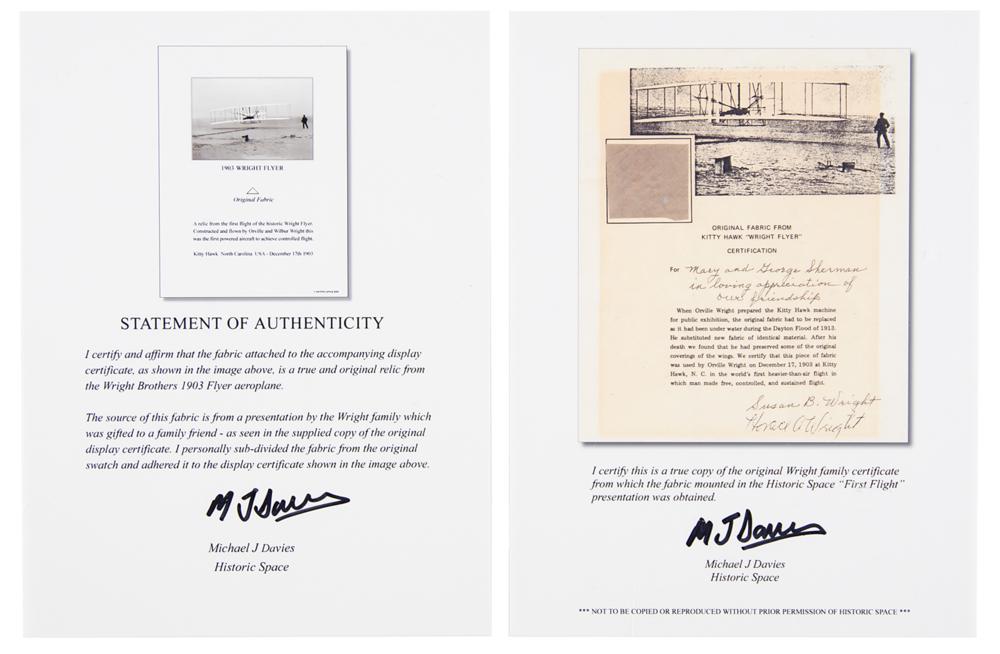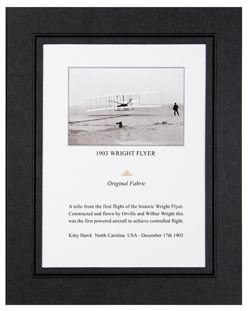 A small triangular swatch of wing fabric from the 1903 Wright Flyer that made the first heavier-than-air flight at Kitty Hawk on December 17, 1903. The relic is affixed to a 5.5 x 7.5 informational sheet and housed in its original folder. In very fine condition. Accompanied by certificates of authenticity from Michael Davies, who made the presentations from a larger swatch from the Wright family; one certificate includes a copy of the original presentation sheet from Susan and Horace Wright, reading, in part: "When Orville Wright prepared the Kitty Hawk machine for public exhibition, the original fabric had to be replaced as it had been under water during the Dayton Flood of 1913…After his death we found that he had preserved some of the original coverings of the wings."