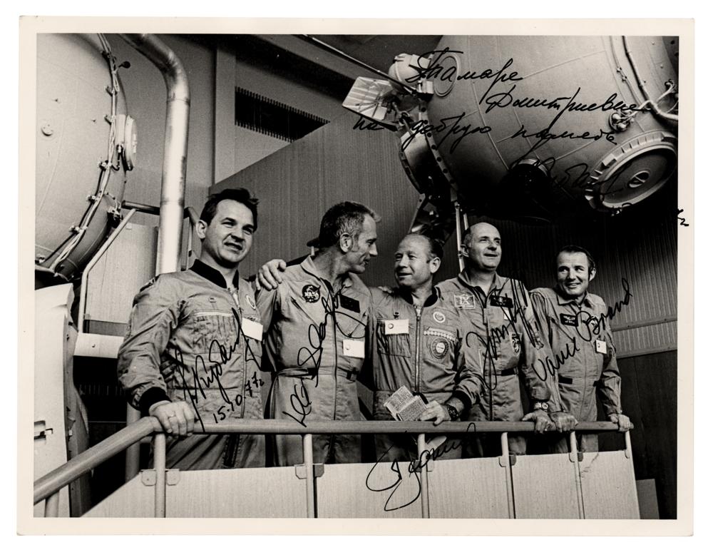 Appealing glossy 10 x 7.75 photo of the two-nation ASTP crew, signed in black felt tip by Tom Stafford, Vance Brand, Deke Slayton, Alexei Leonov, and Valeri Kubasov (twice, with a presentation inscription in the upper right corner dated October 15, 1977). In fine condition, with light scuffing to the emulsion.