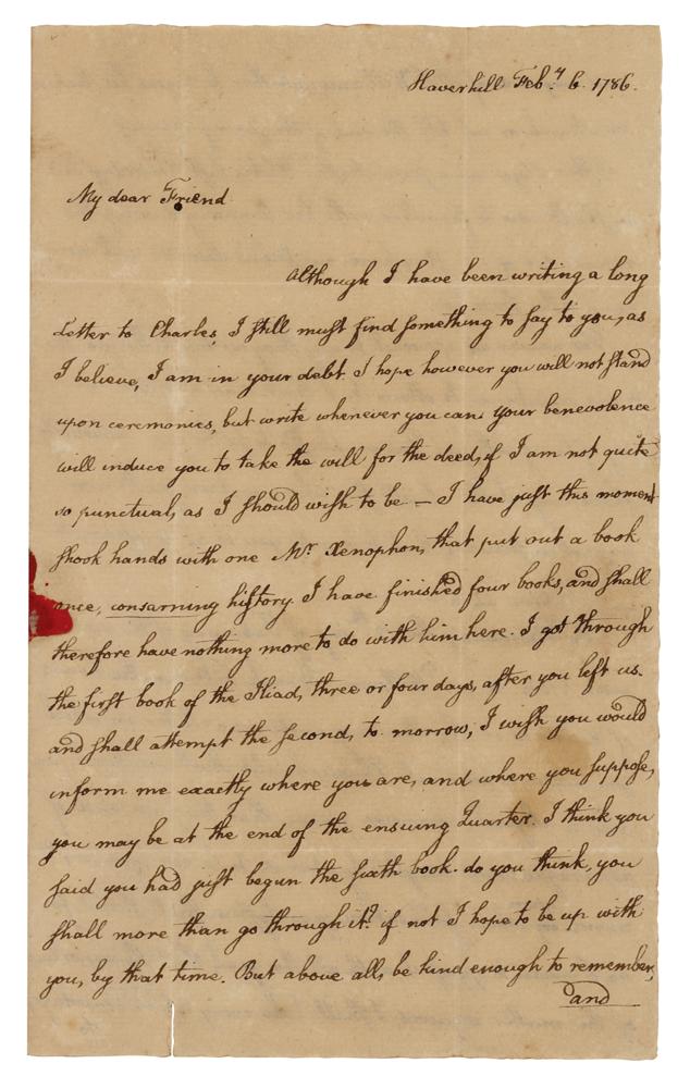 Very early ALS signed “JQA,” three pages on two adjoining sheets, 4.75 x 7.75, February 6, 1786. Handwritten letter from 18-year-old John Quincy Adams to his cousin, William Cranch, both on leave from their studies at Harvard University. The letter, addressed from Haverhill, where Adams was being tutored in Latin and Greek by his uncle, Reverend John Shaw, reads, in full: “Although I have been writing a long Letter to Charles, I still must find something to say to you, as I believe, I am in your debt. I hope however you will not stand upon ceremonies, but write whenever you can. Your benevolence will induce you to take the will for the deed, if I am not quite so punctual, as I should wish to be. I have just this moment shook hands with one Mr. Xenophon, that put out a book once, consarning history. I have finished four books, and shall therefore have nothing more to do with him here. [Adams began Xenophon's Cyropaedia, a historical novel in eight books, in November 1785] I got through the first book of the Iliad, three or four days, after you left us, and shall attempt the second, tomorrow, I wish you would inform me exactly where you are, and where you suppose, you may be at the end of the ensuing Quarter. I think you said you had just begun the sixth book, do you think, you shall more than go through it? If not I hope to be up with you, by that time. But above all, be kind enough to remember, and enquire of Mr: Williams, whether he begins his Lecture, in March, or not till the end of the spring Vacancy [Samuel Williams, Hollis Professor of Mathematics and Natural and Experimental Philosophy at Harvard College, offered a lecture course on experimental philosophy (physics) annually].
