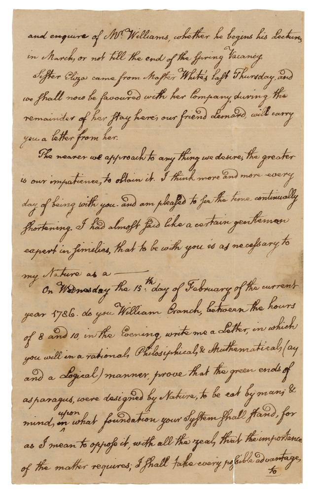 On Wednesday the 15th: day of February, of the current year 1786, do you William Cranch, between the hours of 8 and 10, in the Evening, write me a Letter, in which you will in a rational, Philosiphical, and Mathematical, (ay and a Logical) manner, prove that the green ends of asparagus, were designed by Nature, to be eat by man; and mind, upon what foundation your System shall stand, for as I mean to oppose it, with all the zeal, that the importance of the matter requires; I shall take every possible advantage, to support my plan: which is that the white ends were designed by nature for the food of man. However if you are of my opinion, I would not force you to maintain the Contrary; because I always stand up for Liberty of Conscience, and I exhort you, in the discussion of this Question, to be cool; because, violence never can do good to any System, upon a contested point. I might enlarge upon this subject, but will wait for your answer, first.