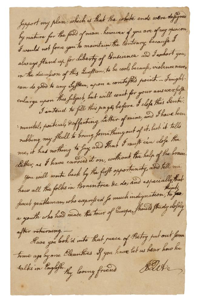 This interesting epistle to his friend, cousin, and fellow Harvard man William Cranch, outlines both John Quincy Adams's voracious appetite for the classics—here he makes reference to Xenophon's Cyropaedia, Homer's Iliad, and Cleanthes' 'Hymn to Zeus'—and his penchant for playful philosophy, putting forth a challenge to develop a system of thinking wherein the green ends of asparagus are fit to be consumed by man. However, steadfast in his ideals, Adams insists upon his belief in 'liberty of conscience,' and would not dare to force his friend to argue a side in which he does not firmly believe. At Harvard, Adams excelled academically, graduating second in his class in 1787. A fabulous letter showcasing Adams's diverse literary interests and his other intellectual pursuits.