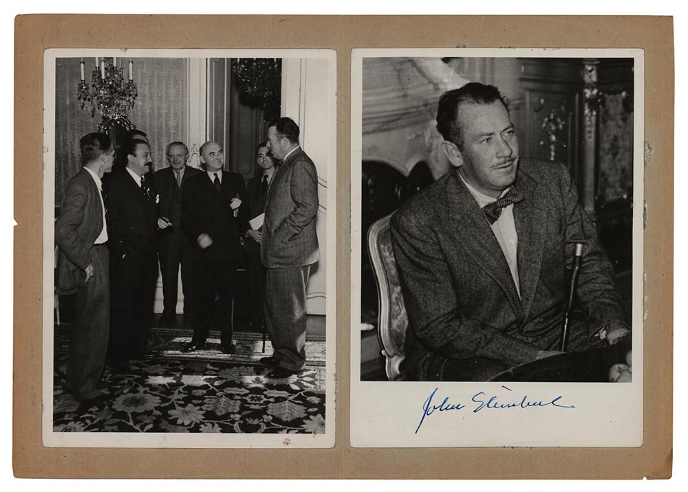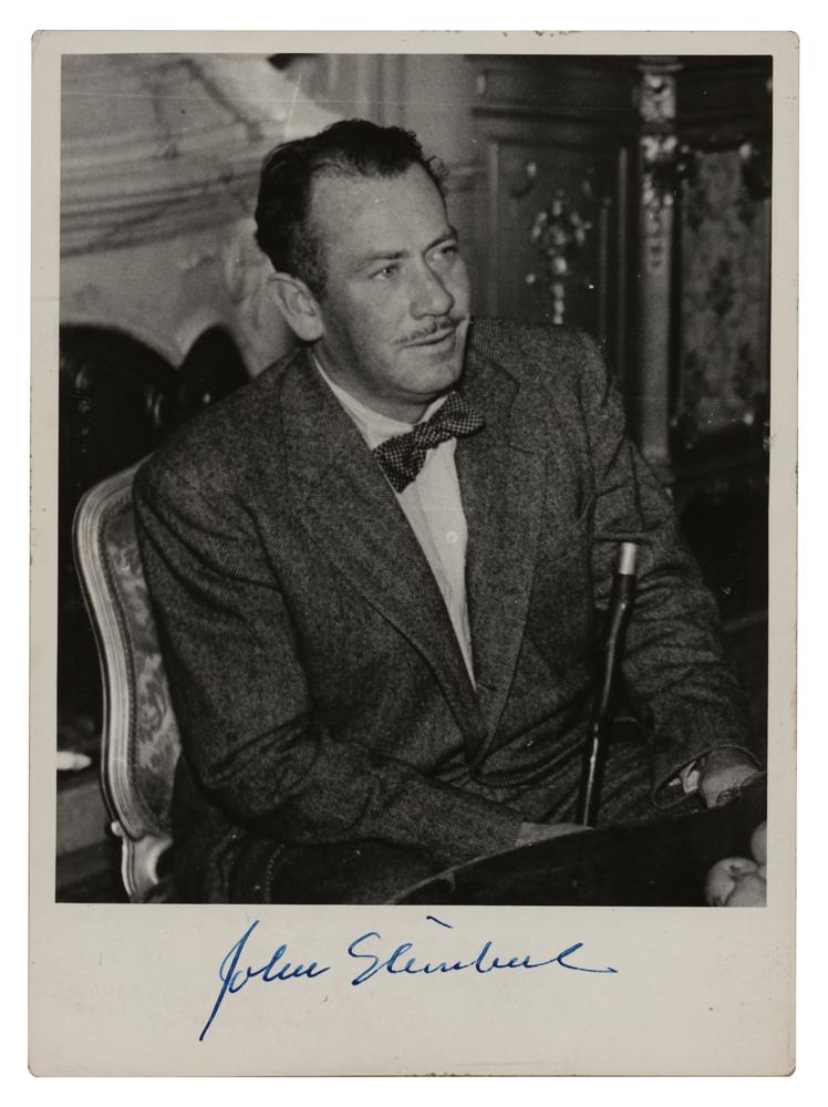 Scarce vintage glossy 5 x 7 half-length photo of the great American novelist in a seated pose, signed in the lower border in fountain pen, "John Steinbeck." Affixed inside a paper folder alongside a photo of him meeting with several well-dressed men. In fine condition. Steinbeck is quite uncommon in this format, with his autograph typically found on letters or cards.