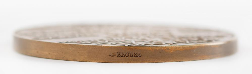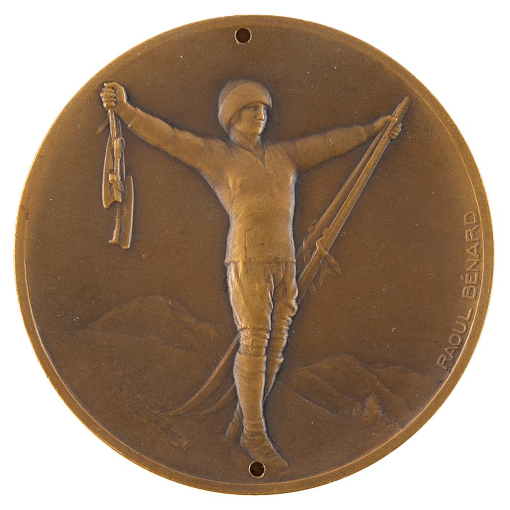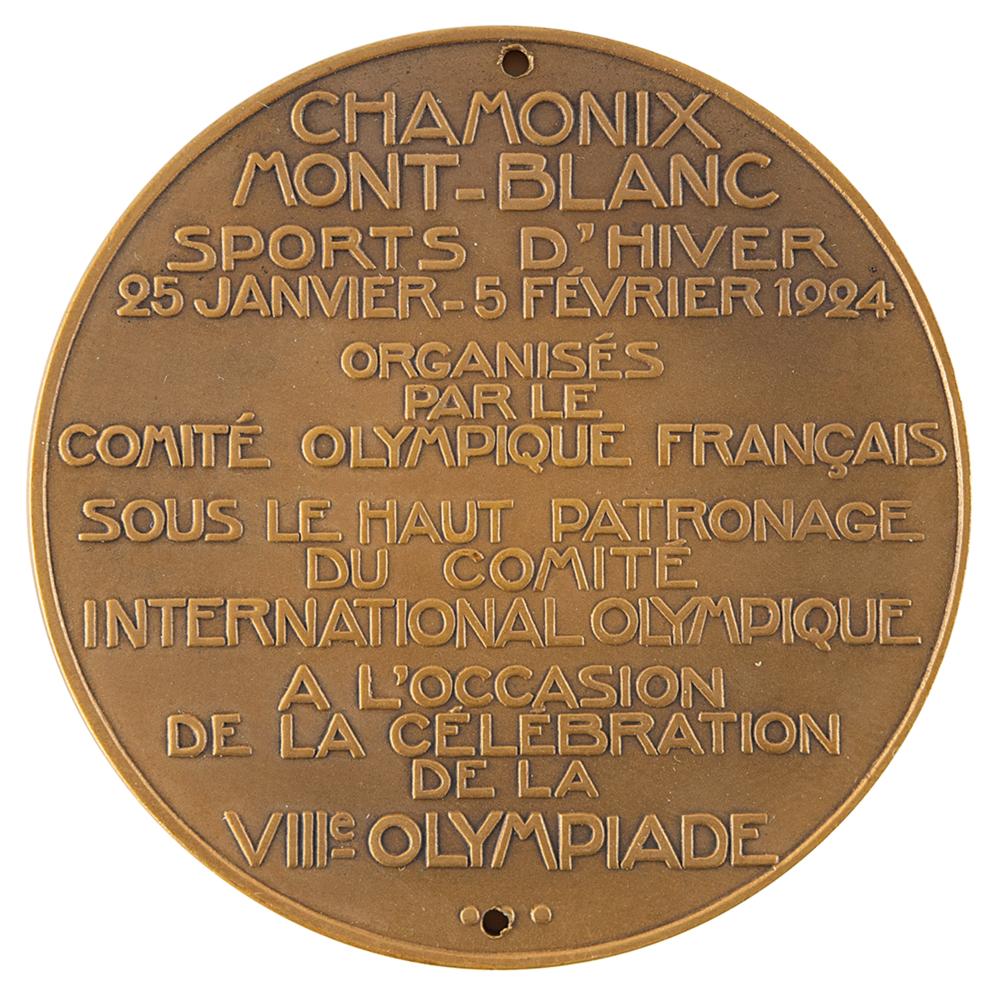 Exceedingly rare medal from the Chamonix 1924 Winter Olympics, which was issued as the bronze medal to third-place winners and also used as the participation medal of the Games. Bronze, 56 mm, 69 gm, by Raoul Benard, Paris. The front features a victorious athlete holding ice skates and skis high in the air with the Alps in the background; the reverse is inscribed at length in French, "Chamonix Mont-Blanc Sports D'Hiver, 25 Janvier-5 Fevrier 1924, Organises par le Comite Olympique Francais sous le haut patronage du Comite International Olympique a l'occasion de la celebration de la VIII Olympiade [Chamonix Mont-Blanc Winter Sports, 25 January-5 February 1924, Organized by the French Olympic Committee under the patronage of the International Olympic Committee on the occasion of the celebration of the VIII Olympiad]." The edge is stamped "Bronze,” and the top and bottom sections bear small holes for display purposes.