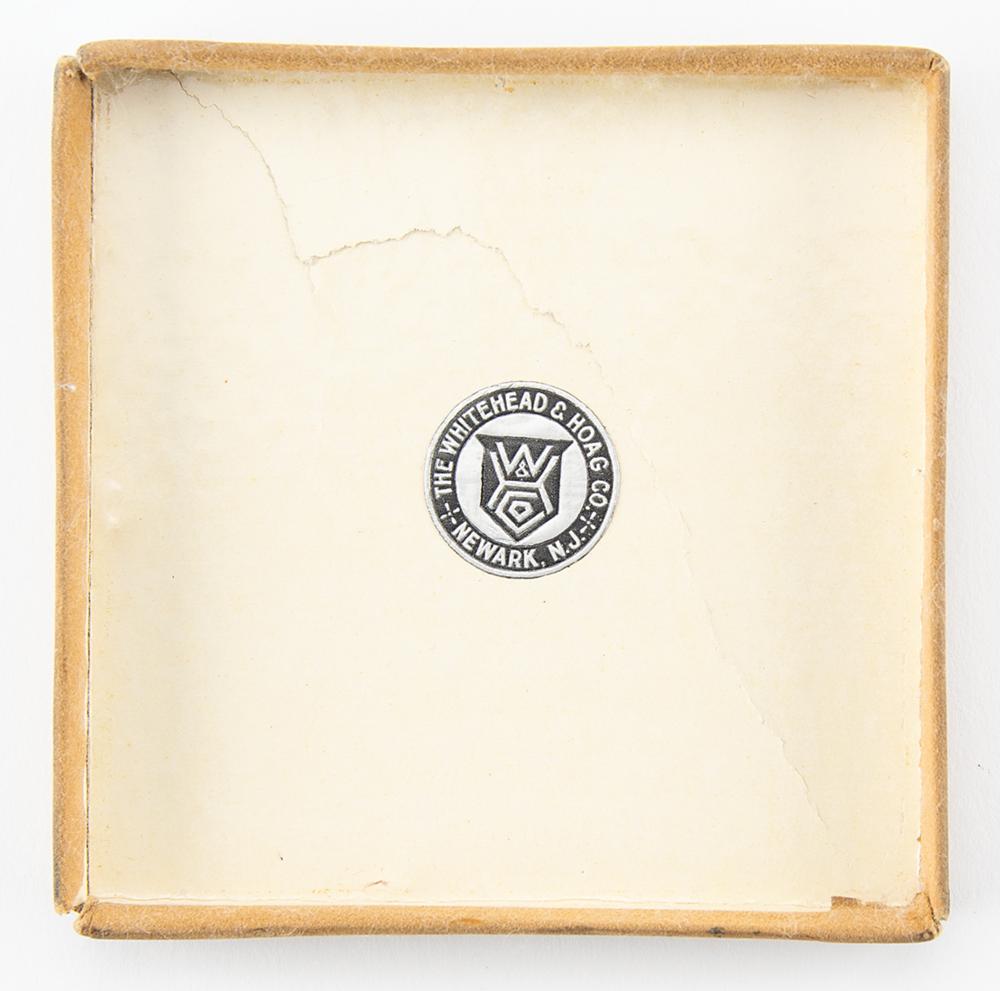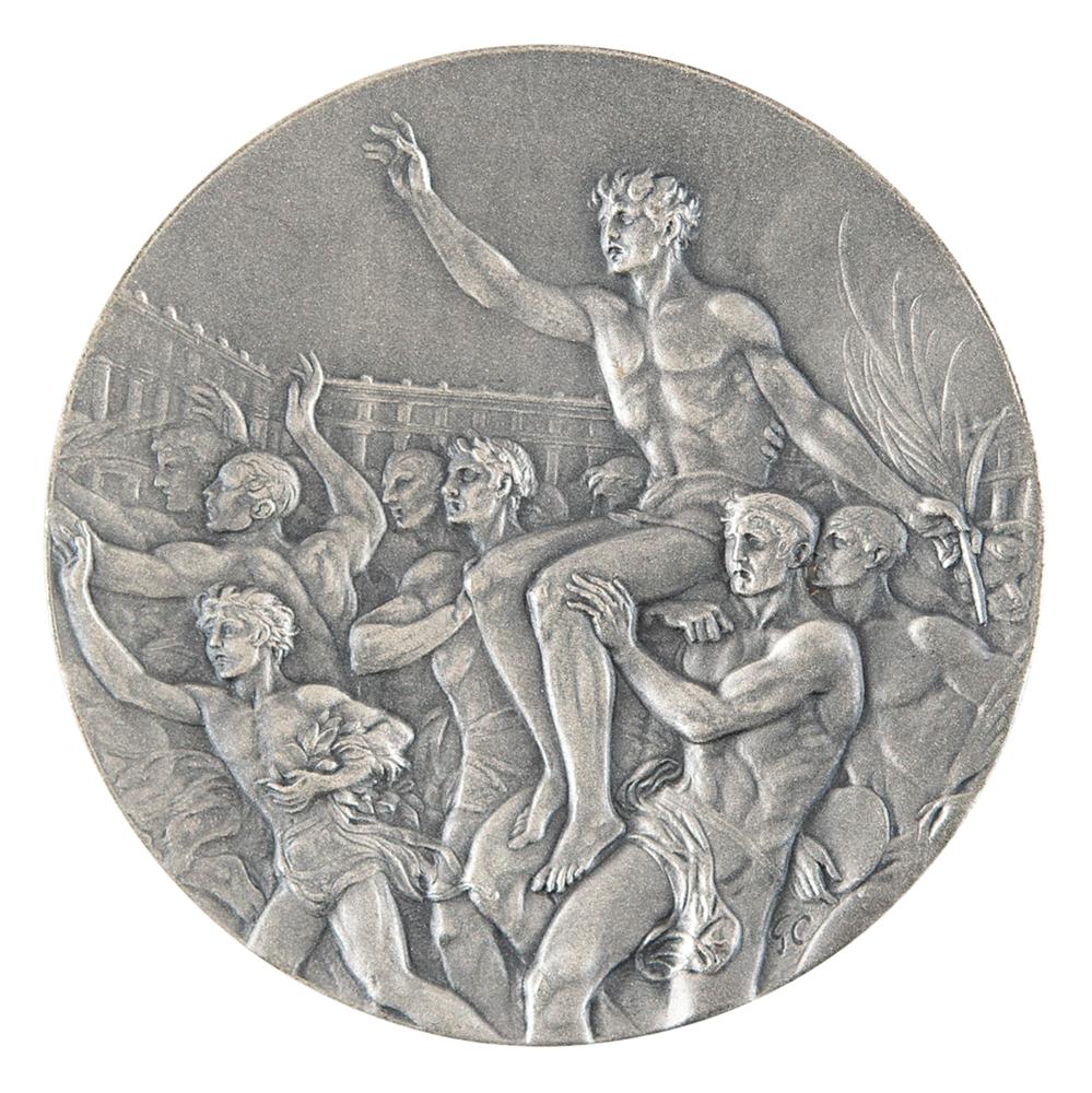 Winner's medal issued for the Los Angeles 1932 Summer Olympics. Silver, 55 mm, 72 gm, by Giuseppe Cassioli. The front, inscribed, "Xth Olympiad, Los Angeles, 1932," features a 'Seated Victory' with the Coliseum in the background; the reverse portrays a winner carried by jubilant athletes. Includes its rare original paper box from Whitehead & Hoag. An ideal example of this classic design.